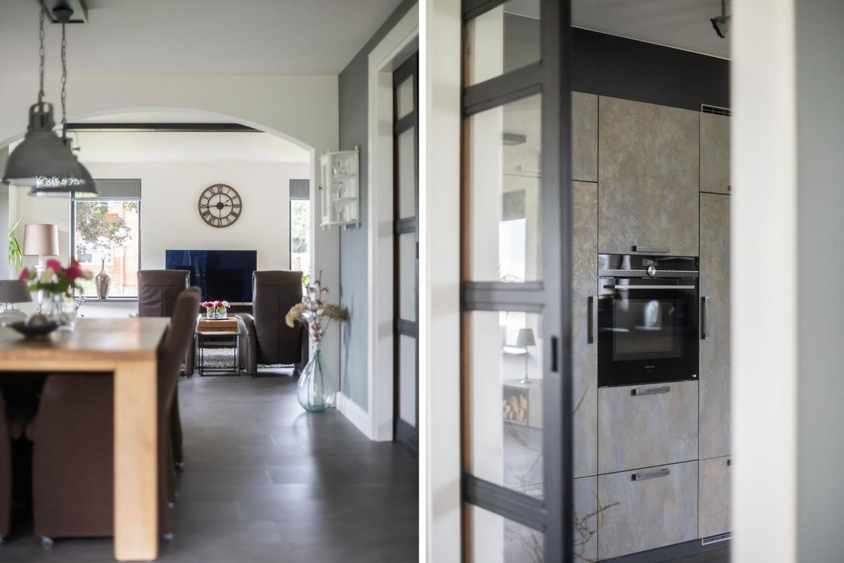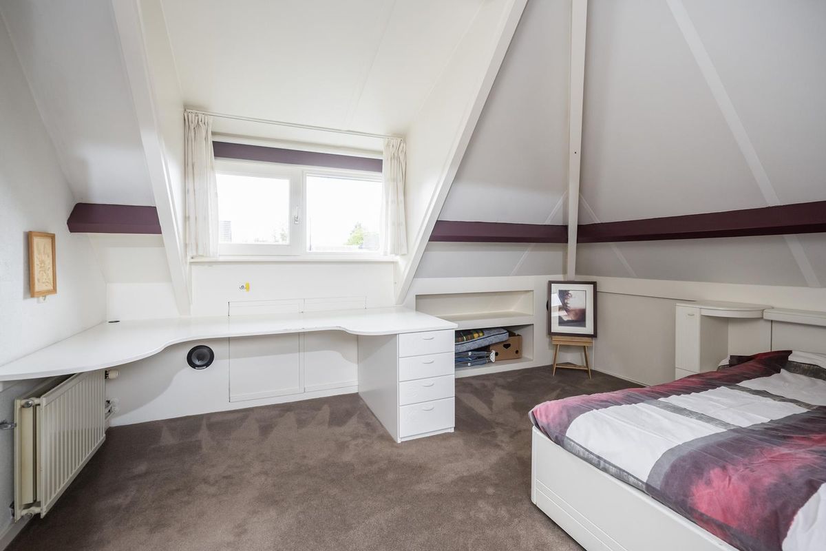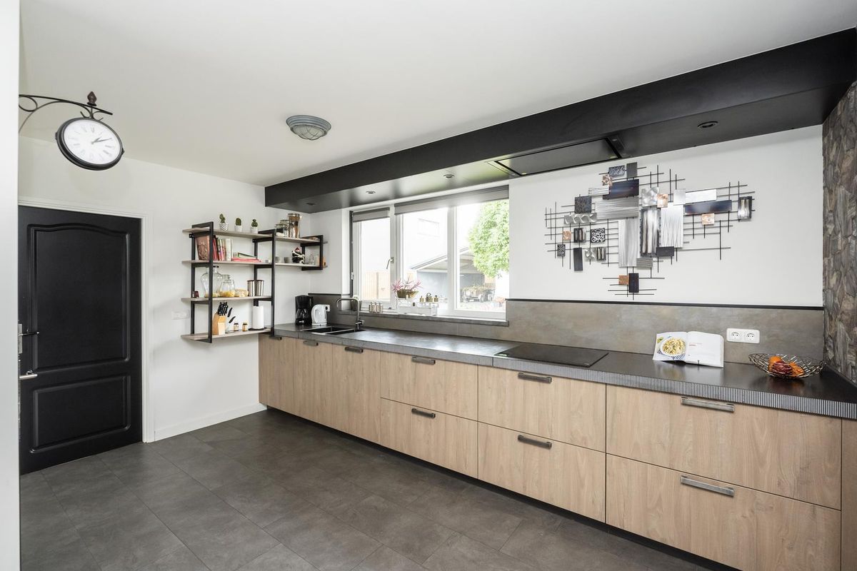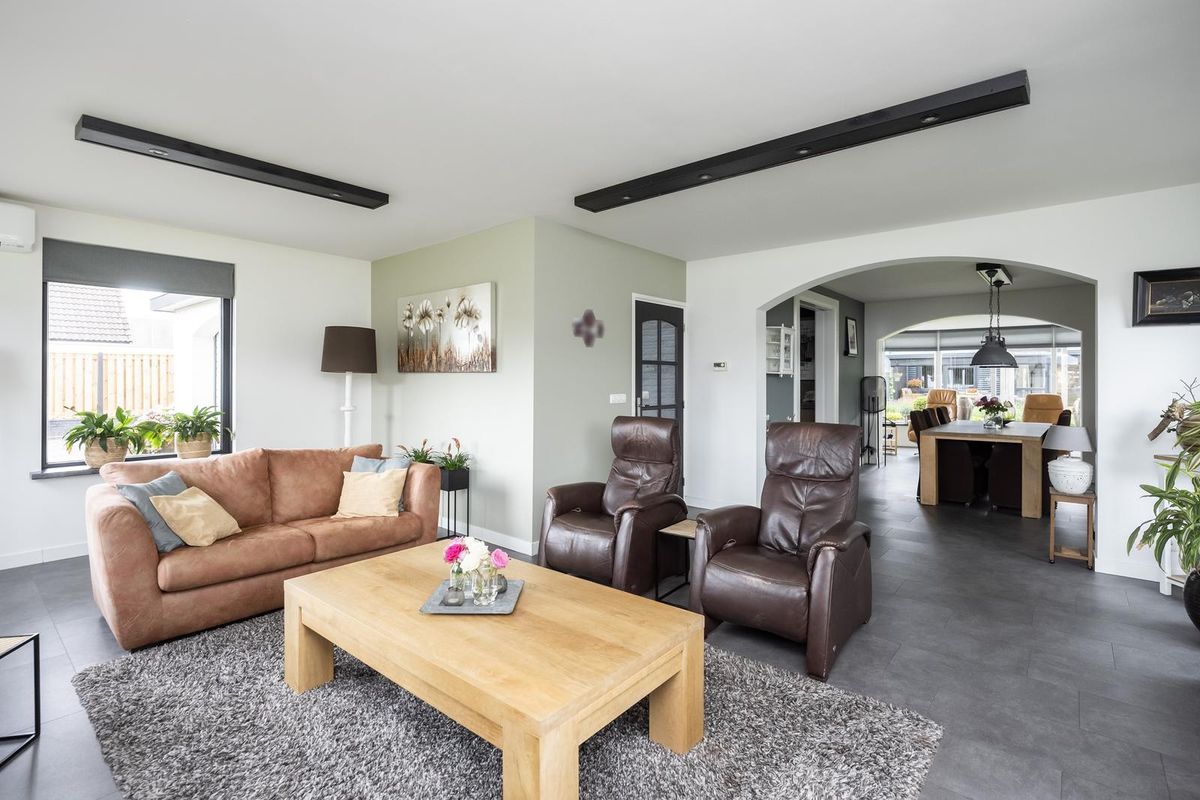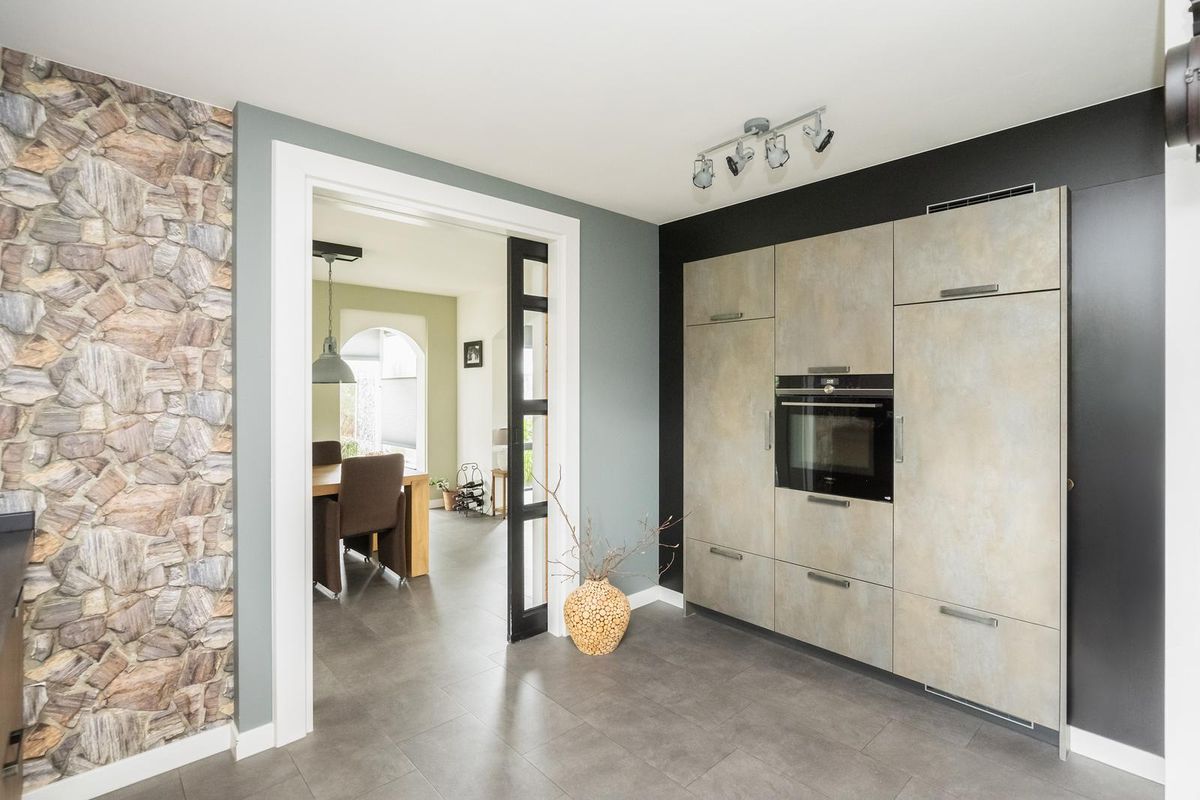 De ruime woonkamer straalt warmte en gezelligheid uit, mede dankzij de gashaard met afstandsbediening. Grote ramen zorgen voor veel daglicht en de airco biedt zowel koelte in de zomer als extra warmte in de winter. Aangrenzend ligt de eetkamer met sfeervolle erker, een heerlijke plek om uitgebreid te tafelen met uitzicht op de tuin. Via een schuifdeur bereikt u de moderne open keuken (2019), voorzien van diverse inbouwapparatuur, veel werk- en bergruimte.