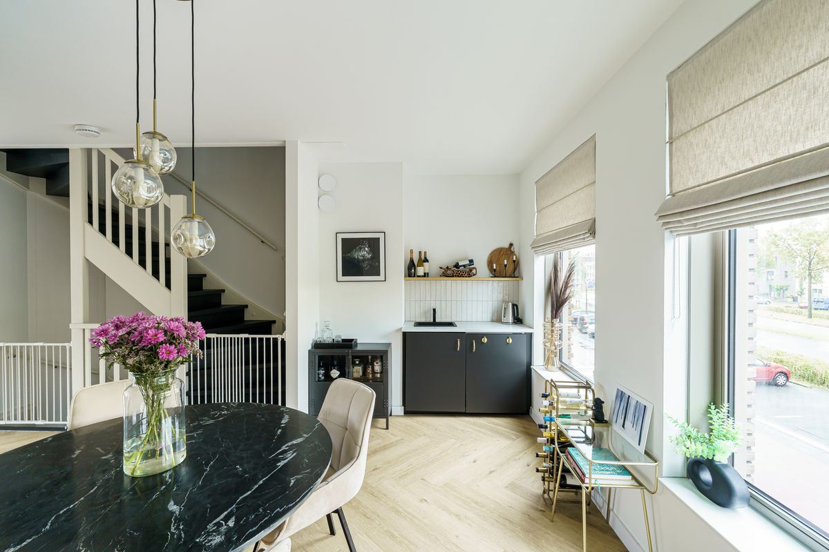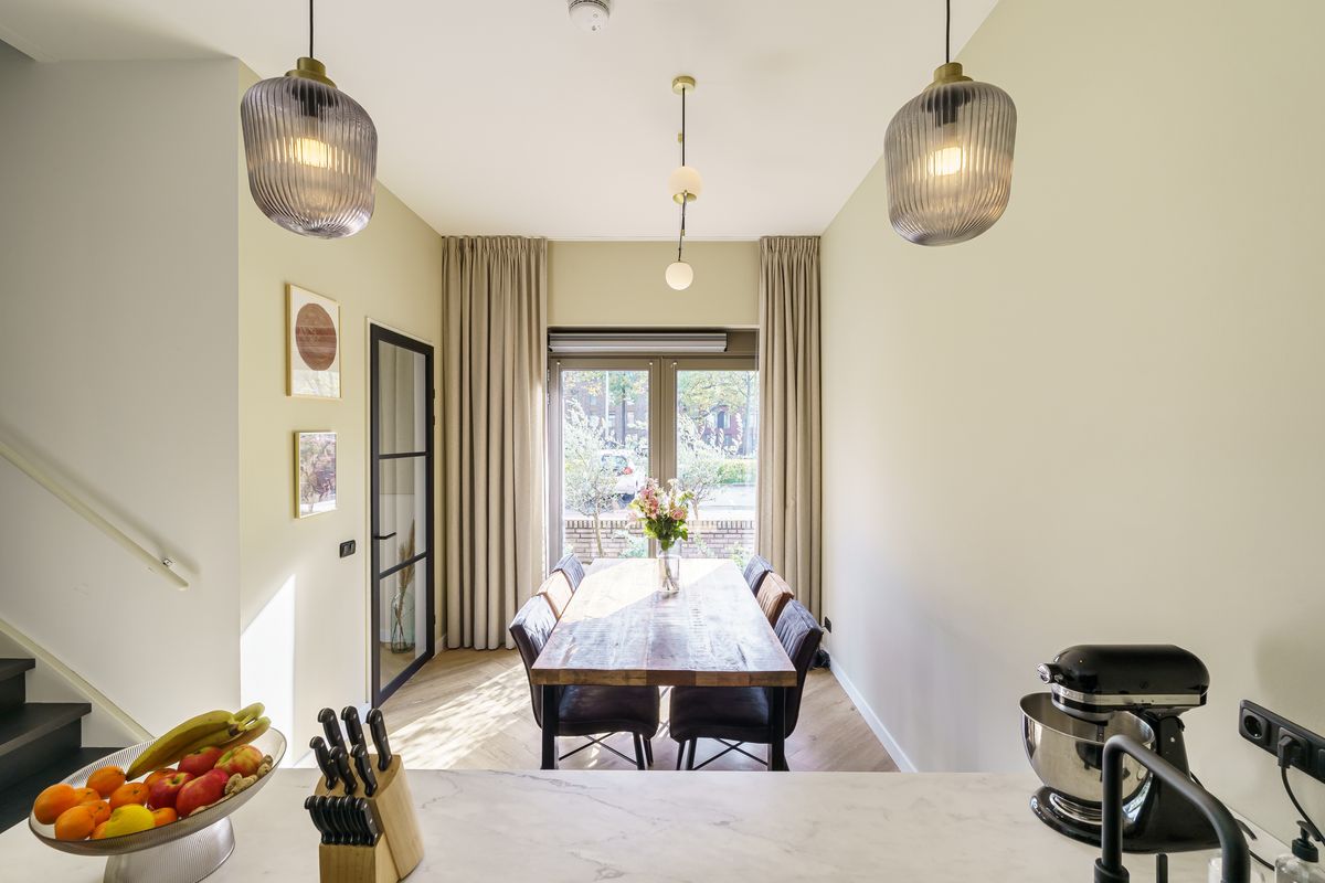 Je komt binnen via de voortuin in de hal, met toegang tot de gezellige woonkeuken. De keuken heeft een praktische parallelopstelling en is van alle gemakken voorzien: een kookplaat met afzuiging, (combi)magnetron, oven, Quooker, vaatwasser, koelkast en vriezer. Dankzij de dubbele openslaande deuren valt er veel licht naar binnen en loop je zo naar buiten. En handig: onder de trap is extra bergruimte.