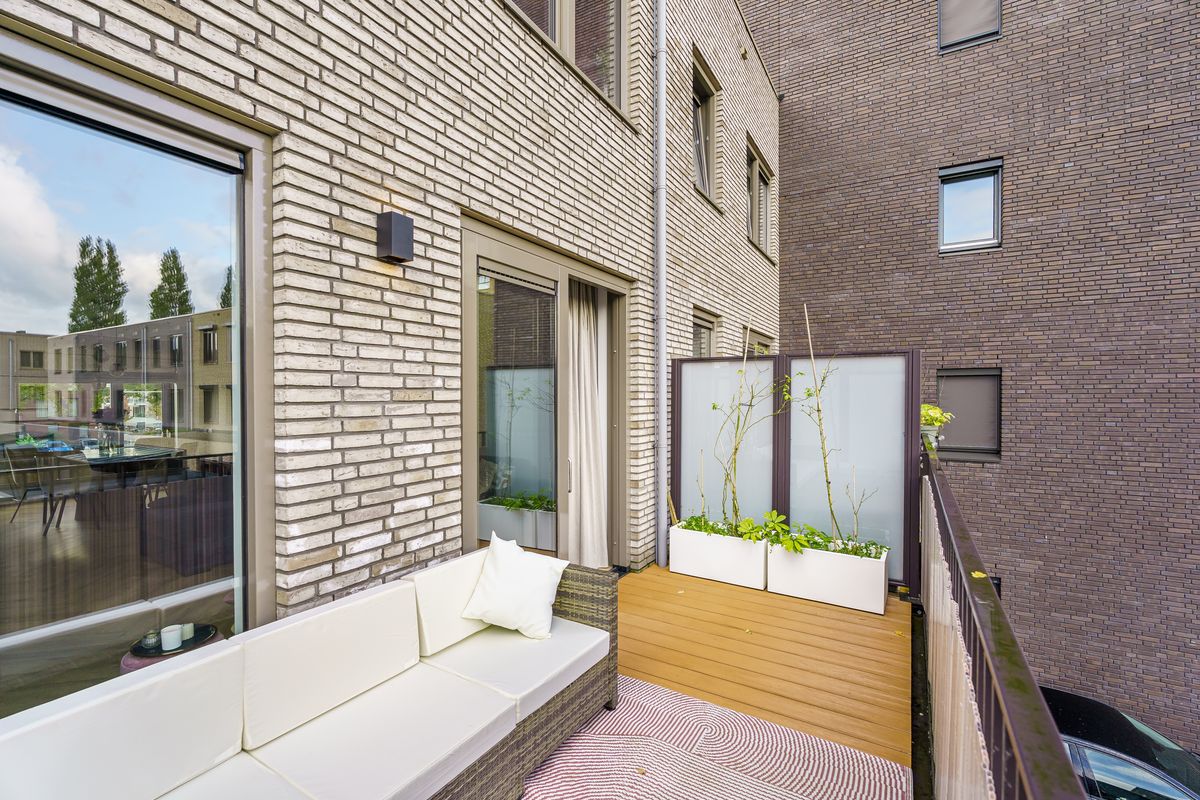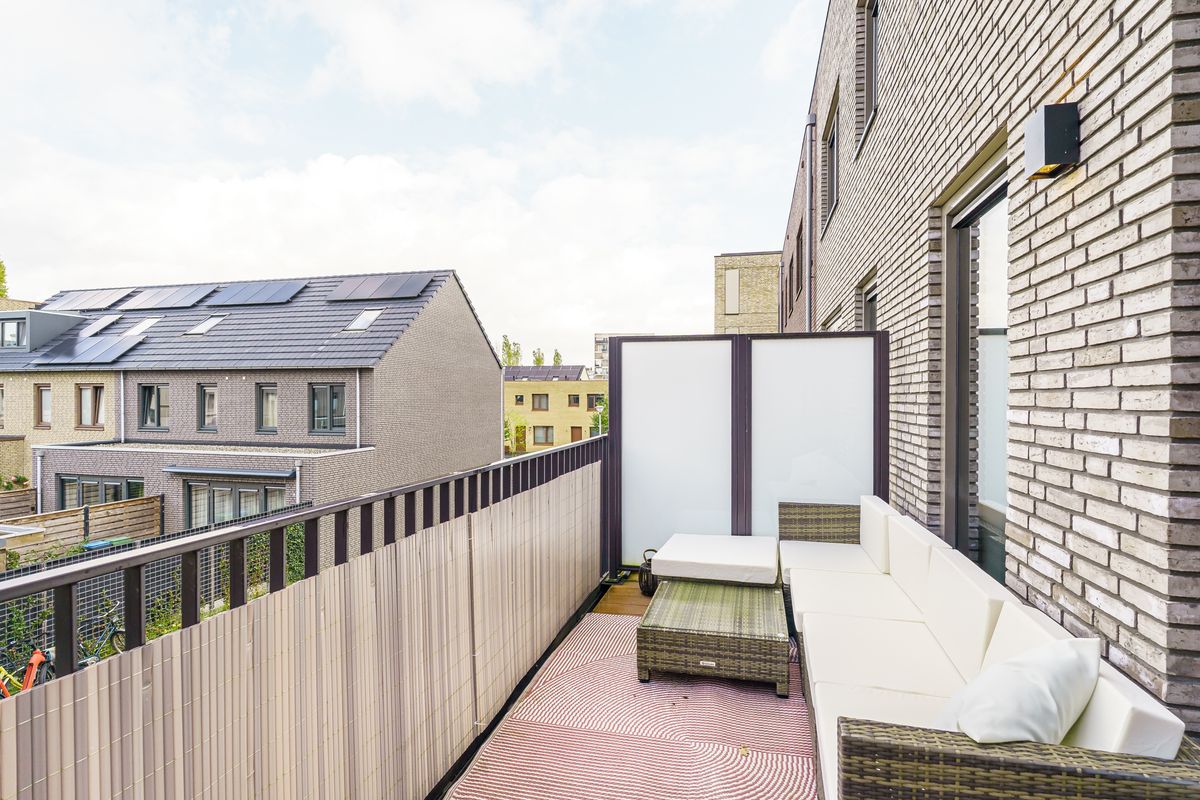 Op de eerste verdieping vind je de ruime woonkamer met een kleine pantry en toegang tot het balkon van ruim 10 m² met houten vlonders. Een fijne plek om te relaxen of gezellig met vrienden te borrelen.