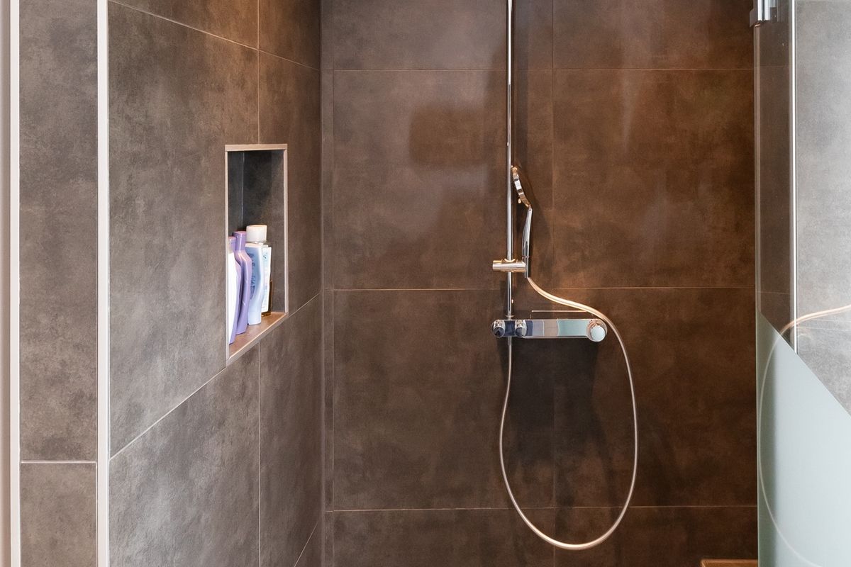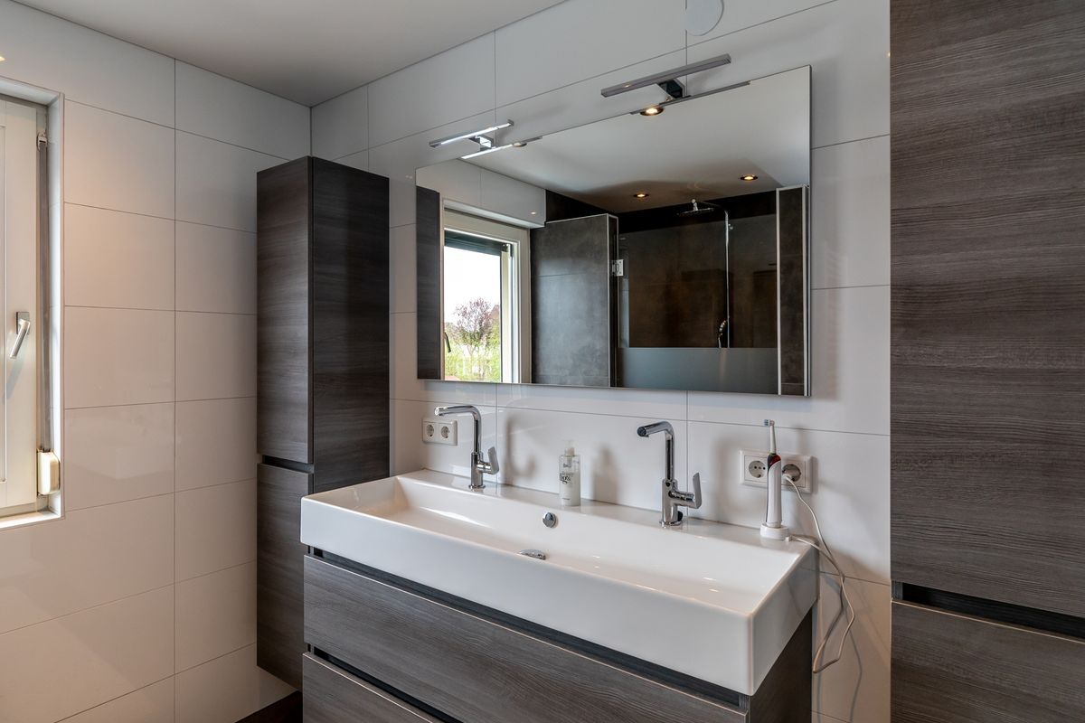 De badkamer is functioneel ingericht en voorzien van vloerverwarming. Geen koude voeten tijdens het tandenpoetsen dus! De dubbele wastafel met strak meubel zorgt ervoor dat u elkaar niet in de weg zit tijdens het ochtendritueel. De inloopdouche is voorzien van zowel een luxe regendouche als een praktische handdouche, waarbij de handige nis in de wand uw doucheproducten binnen handbereik houdt. Extra prettig is het raam, waardoor u niet alleen van daglicht geniet maar ook voor natuurlijke ventilatie zorgt. Tot slot geeft de combinatie van witte en antracietgrijze tegels de badkamer een eigentijdse uitstraling.