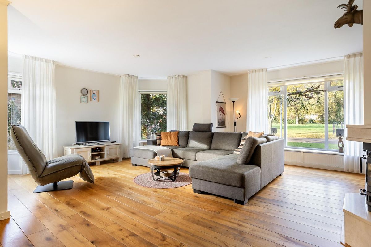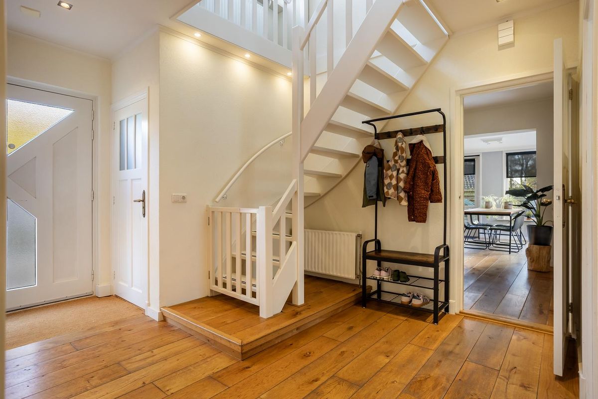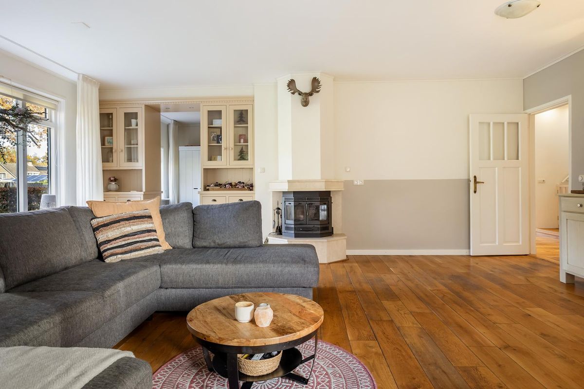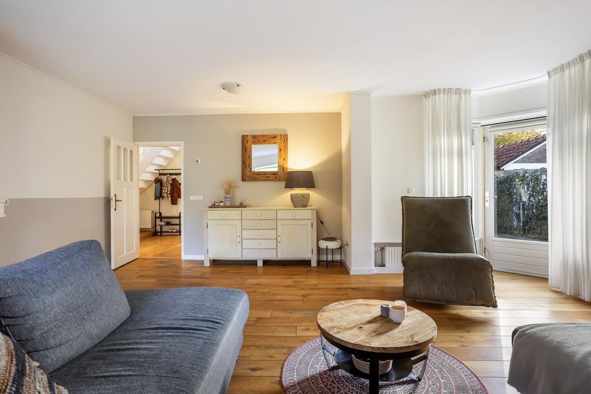 De gehele begane grond is v.v. een fraaie eiken plankenvloer, neutraal afgewerkt, heeft goed contact met de tuin en u ervaart een fijne woonbeleving.