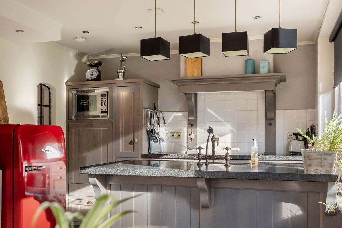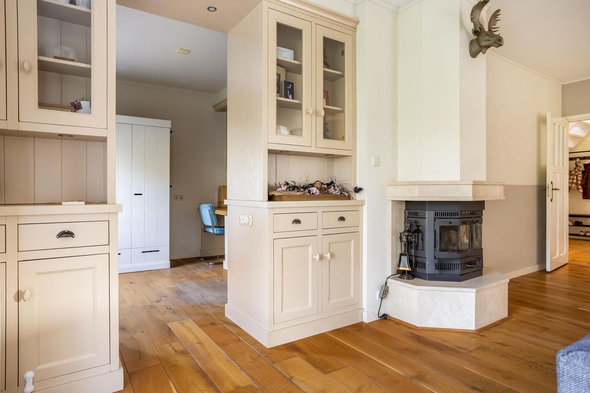Indeling; entree in de lichte, centrale hal, zeer royale en uitgebouwde woonkamer met een sfeervolle haardpartij, terrasdeur en een heerlijk uitzicht, doorgang naar de werk-/ studeerruimte die direct aan de woonkamer grenst. Weer aangekomen in de centrale hal bereikt u de complete en stijlvolle badkamer v.v. inloopdouche, bad, teakhouten elementen en badmeubel v.v. dubbele wastafel, een ruime ouderslaapkamer (ca. 18 m2) v.v. ombouw en vaste kastenwand. De woonkeuken met studeerhoek, eetgedeelte met terrasdeur en fraaie, luxe keuken v.v. granieten werkblad, inductie kookplaat (2023), grote oven, schouwpartij, vaatwasser (2023), combi- magnetron en koel-/ vriescombinatie, doorgang naar de bijkeuken met witgoedaansluitingen en een deur naar de geïsoleerde garage waar vanuit de oprit en een multifunctionele berging te bereiken zijn en vanuit de berging is er een achterom naar de tuin.