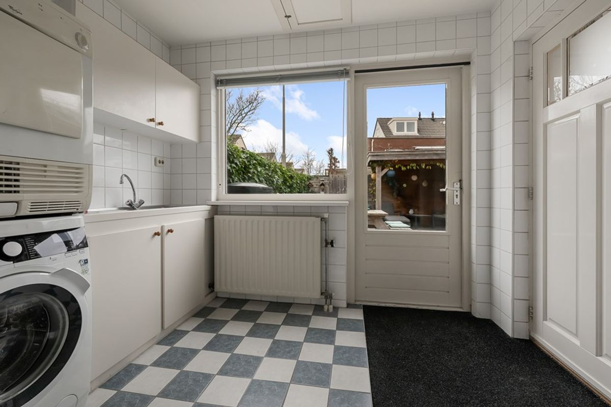 Een bijzonder pluspunt van deze woning is de zijuitbouw met inpandig bereikbare bijkeuken. Deze multifunctionele ruimte is voorzien van een extra keukenblok, aansluitingen voor wasmachine en wasdroger en biedt directe toegang tot de achtertuin. De bijkeuken geeft ook directe toegang tot de schuur.
