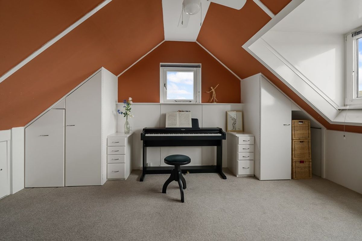 Via een vaste trap bereikt u de tweede verdieping. Hier bevindt zich een ruime vierde slaapkamer met dakkapel en praktische inbouwkasten, wat zorgt voor extra lichtinval en veel bergruimte. Deze verdieping is ook uitstekend geschikt als werk- of hobbyruimte.