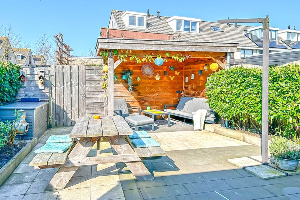 De achtertuin is verzorgd aangelegd met een combinatie van bestrating en beplanting. Dankzij de aanwezige overkapping kunt u hier het hele jaar door genieten van het buitenleven, ongeacht het seizoen.