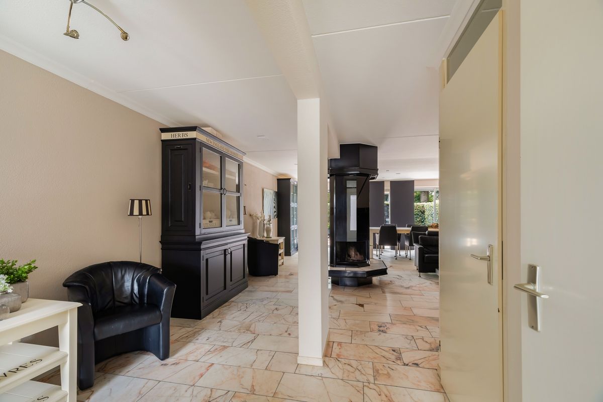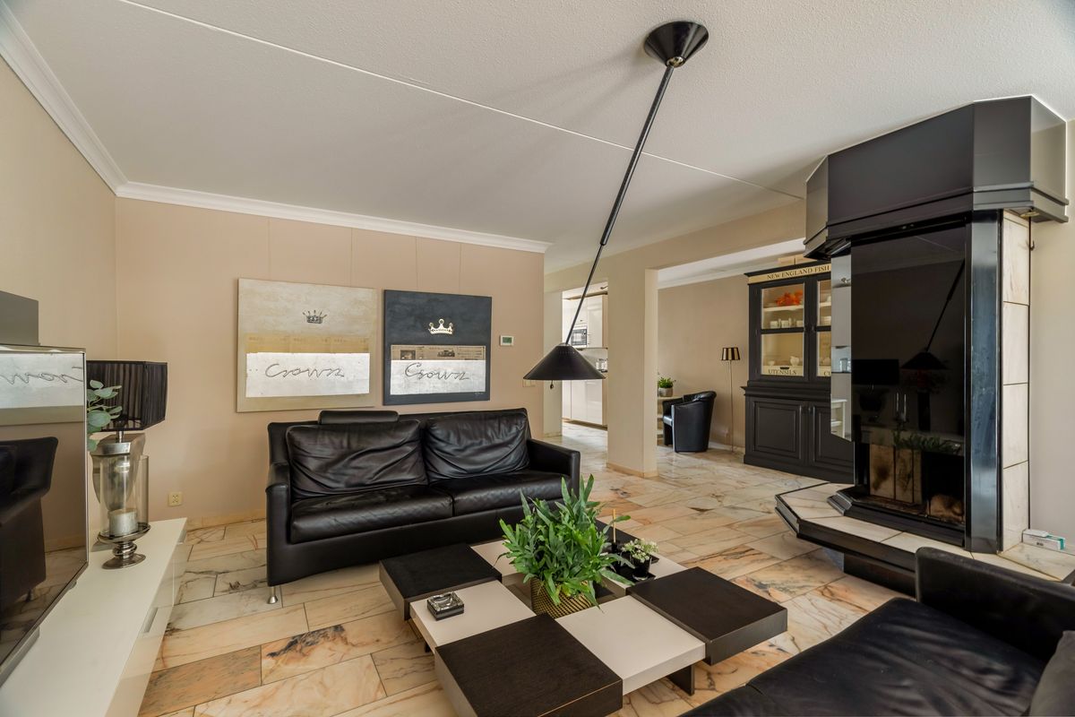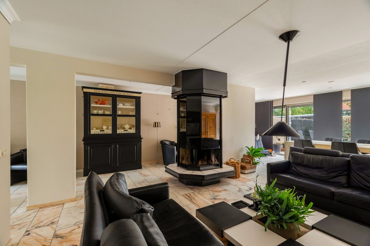 Bij binnenkomst valt direct de ruime, uitgebouwde woonkamer op. Dankzij de grote, dubbele aluminium schuifpui loopt de living als vanzelf over in de zonnige achtertuin – een heerlijke plek om te ontspannen of te borrelen in de namiddagzon. U kijkt hier uit op het omringende groen en geniet van de rustige omgeving.