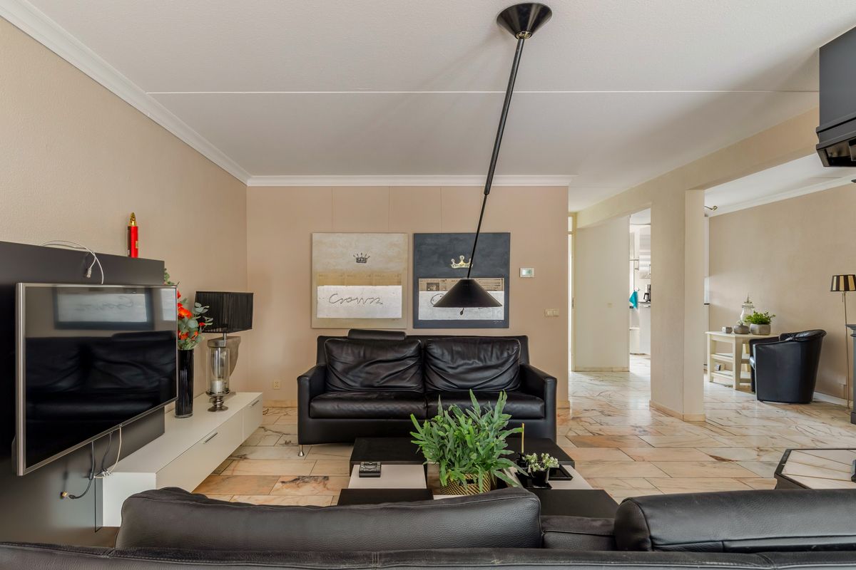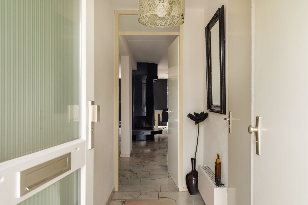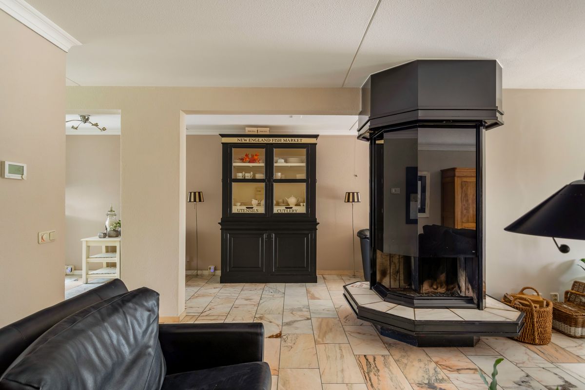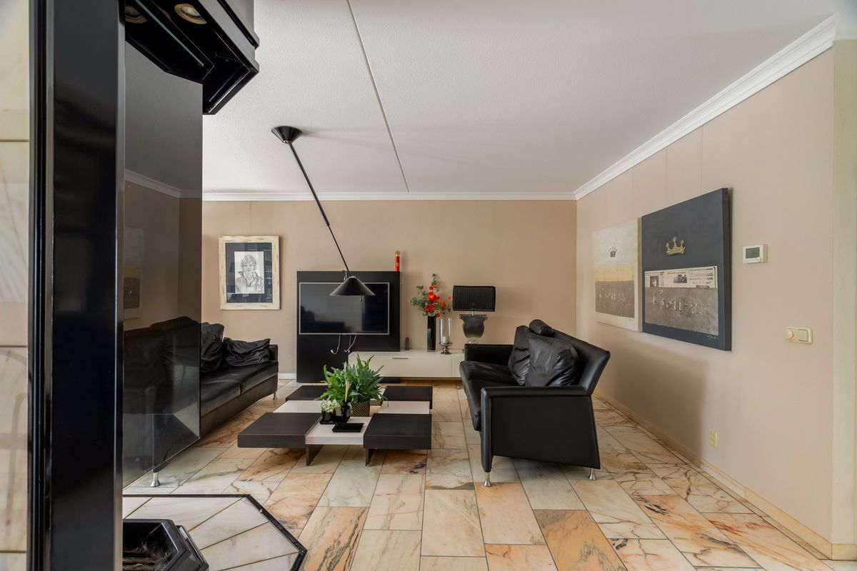 Bij binnenkomst valt direct de ruime, uitgebouwde woonkamer op. Dankzij de grote, dubbele aluminium schuifpui loopt de living als vanzelf over in de zonnige achtertuin – een heerlijke plek om te ontspannen of te borrelen in de namiddagzon. U kijkt hier uit op het omringende groen en geniet van de rustige omgeving.