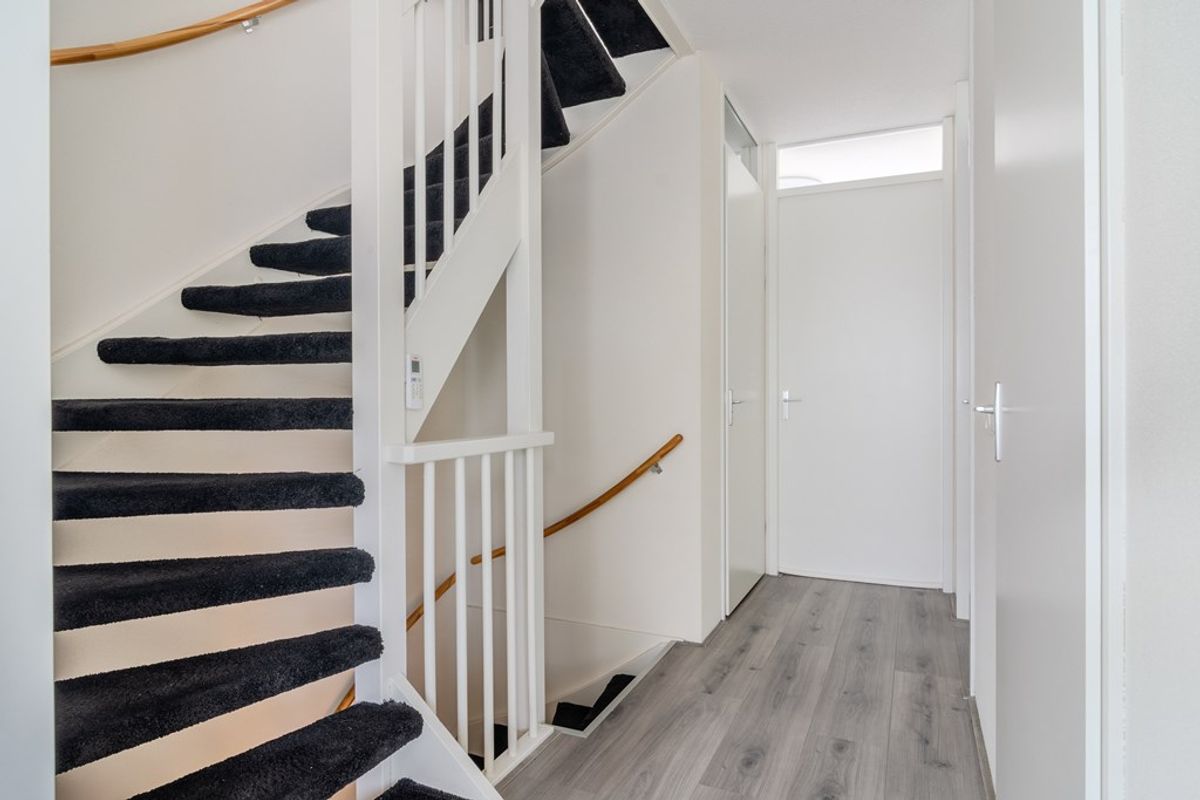 Hal, modern toilet, trapopgang, witte hoogglans frontkeuken, brede woonkamer en glazen serre met toegang tot zonnige achtertuin (zw)