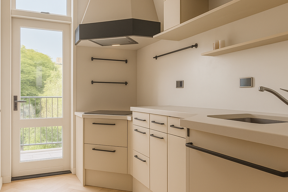 Middels de toegangsdeur is het balkon vanuit de keuken te bereiken.
