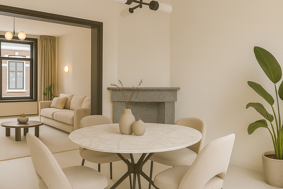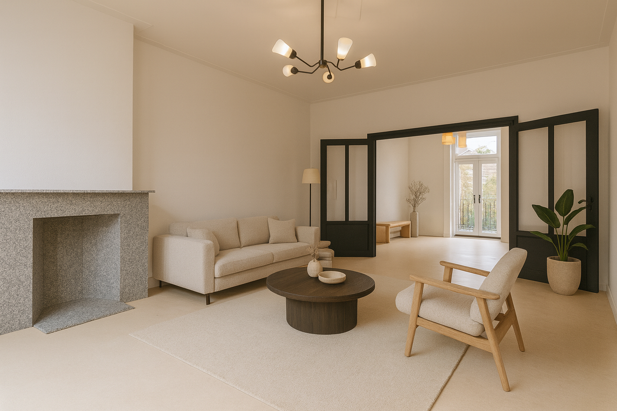 De indrukwekkende living geeft een fijne lichtinval en hoge plafonds. Aan de voorzijde bevindt zich de voorkamer met een plafond v.v. lijsten en een granieten schouwpartij.