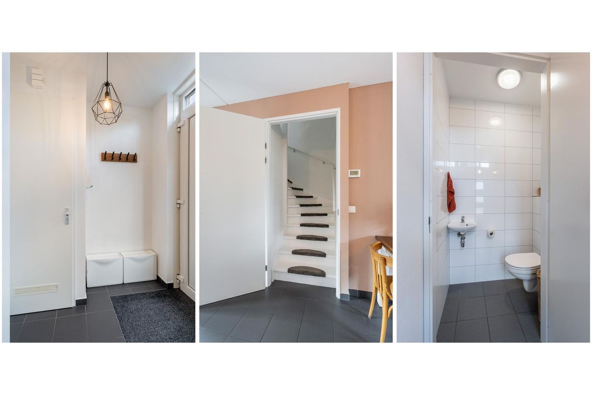 Hal met de meterkast (6 groepen, 2 aardlekschakelaars en slimme meters), het toilet (met hangcloset en fonteintje) en toegang tot de woonkamer.