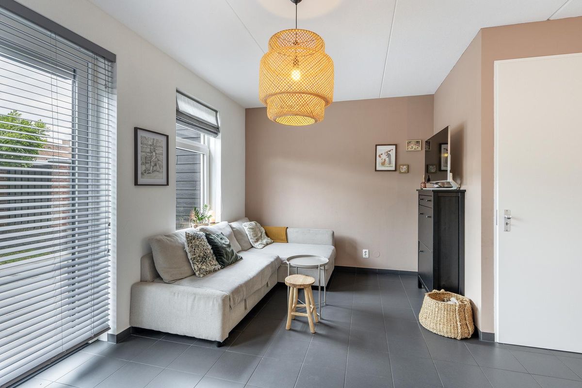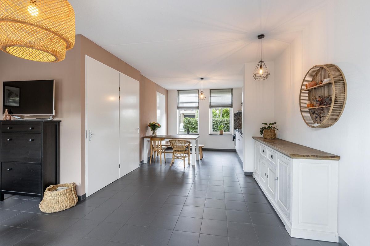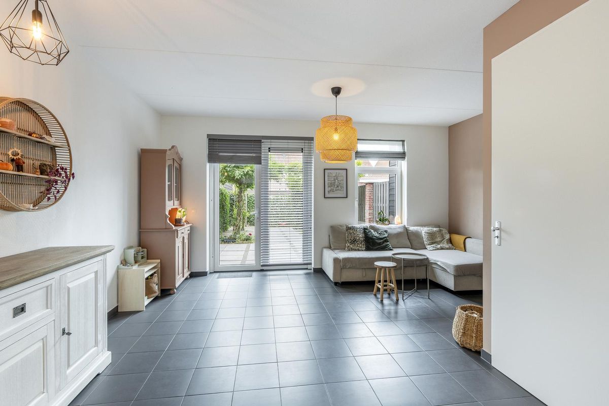 Tuingerichte woonkamer met openslaande deuren naar de tuin. De trapopgang is afgesloten. Onder de trap is een handige provisiekast aanwezig, waar je ook de verdeler van de vloerverwarming vindt.