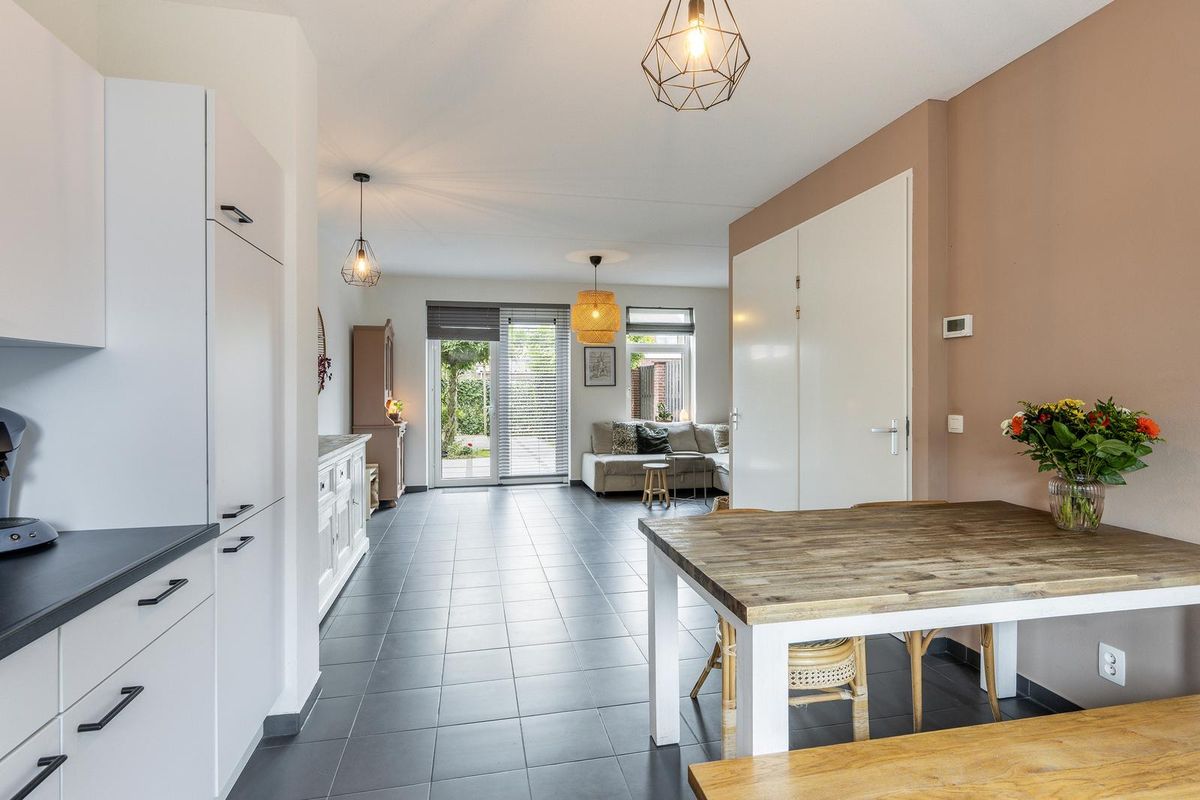 Aan de voorzijde van de woning gelegen woonkeuken, in een lengte-opstelling geplaatst en uitgerust met een 4 pits gaskookplaat, oven, afzuigkap, vaatwasser en koel-vriescombinatie.