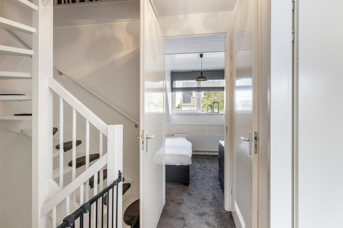 Vaste trap naar de zolder. Hier zou een extra slaapkamer gerealiseerd kunnen worden. In de fraaie op maat gemaakte kastenwand vind je de CV-combiketel (Remeha Tzerra M 28c Plus, 2015) en de unit van de mechanische ventilatie. Aan de achterzijde is een dakraam geplaatst.