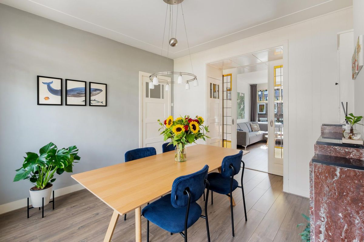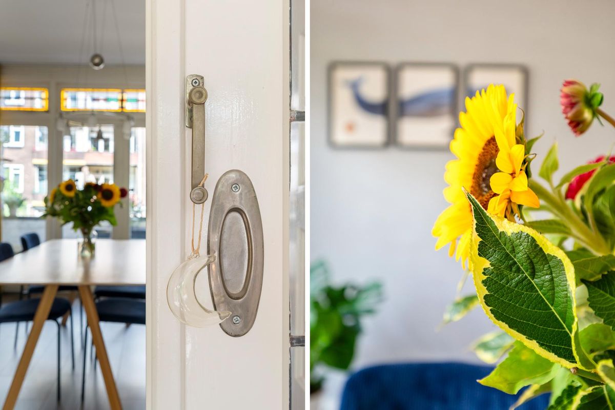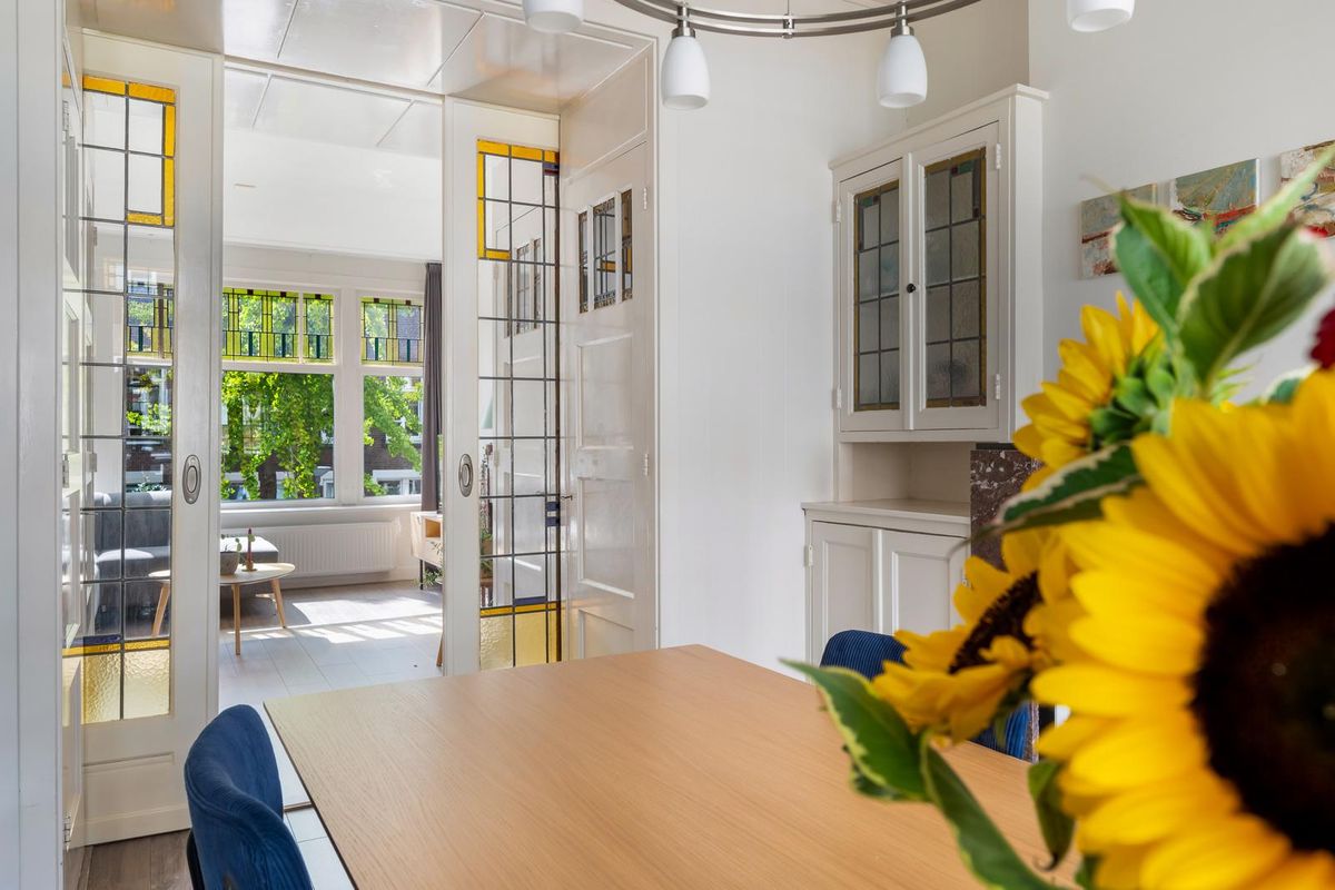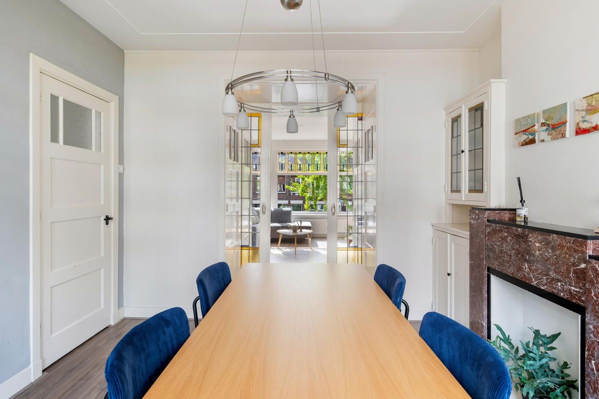 Ruime hal met vaste kast, meterkast en separaat toilet en toegang tot alle vertrekken op deze verdieping. Direct bij binnenkomst valt je oog op de karakteristieke jaren '30 details zoals de plafondlijsten, glas-in-lood ramen, paneeldeuren, schouw en de ensuite schuifdeuren. Dankzij de en suite met inbouwkasten is de ruimte flexibel in te delen, met een mooie scheiding tussen het woon- en eetgedeelte. Dit is ideaal als je de openheid van de leefruimten wil behouden, maar toch