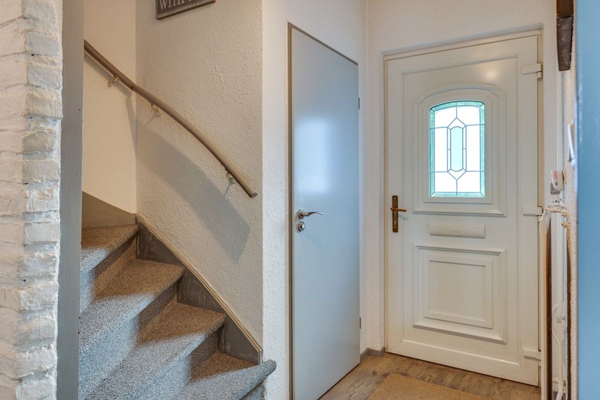 Entrance/hallway, equipped with a coat rack and a staircase to the first floor. Here you will also find the meter cupboard (8 groups and 2 earth leakage switches) and the toilet with washbasin. The spacious living room has a cozy fireplace and PVC laminate flooring. The simple kitchen is decorated in light tones and has plenty of storage space, a gas stove, and an extractor hood. The house has a lovely, sunny south-facing backyard with a detached garage and a wooden shed.