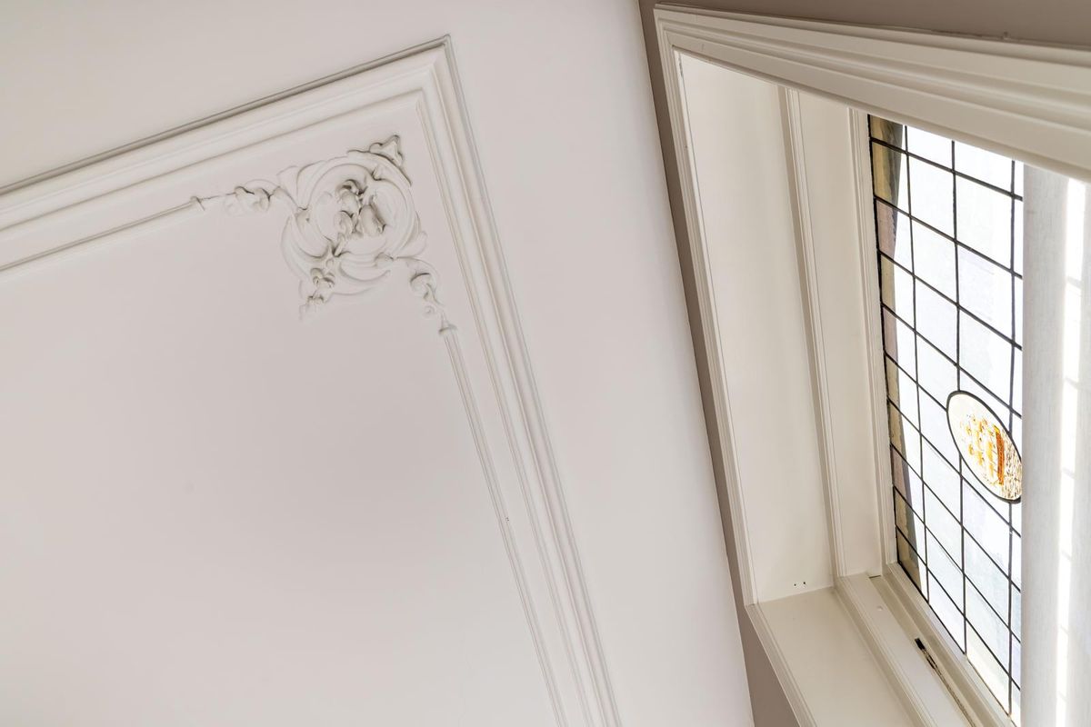 Vanwege de prachtige hoge glas-in-loodramen is de woonkamer erg licht, tevens beschikt ook deze kamer over een prachtige schouw.