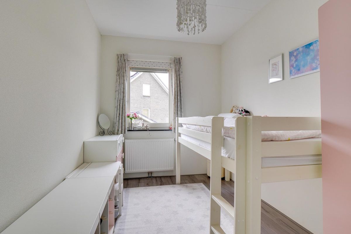 Direct achter de woning ligt het mandelige binnenterrein met een eigen parkeerplaats, zodat je altijd een vaste plek hebt voor de auto. De servicekosten voor het terrein bedragen €130 per jaar. Voor gezinnen is de gezamenlijke speeltuin op dit terrein een groot pluspunt – veilig, overzichtelijk en gezellig voor de kinderen.