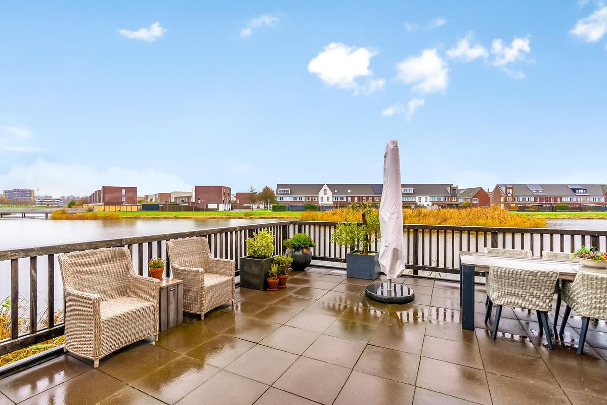 Het grote terras (ca. 25 m²) ligt direct aan de waterzijde. Het terras profiteert dankzij de volledig vrije ligging van een verrassend goed lichtinval: de zon valt op verschillende momenten van de dag langs of over het gebouw heen, waardoor er altijd wel een fijne plek met zon te vinden is.
