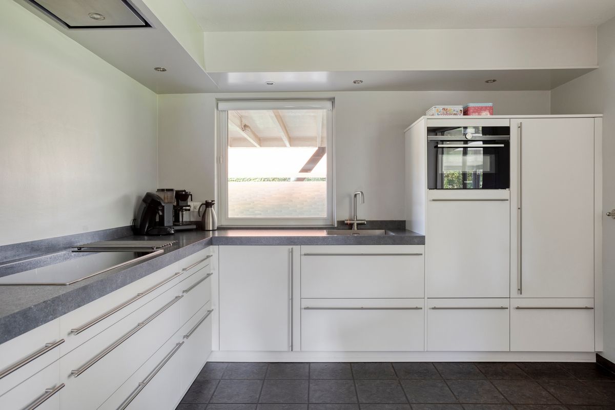 Middels de openslaande deuren in de woonkamer stap je direct de tuin in, waar een fraai overdekte overkapping met screens is gerealiseerd. De begane grond combineert zo een praktische indeling, lichte ruimtes en een directe verbinding met de tuin, waardoor het wonen hier zowel functioneel als sfeervol is.