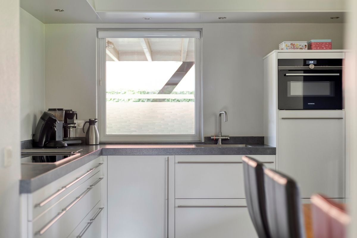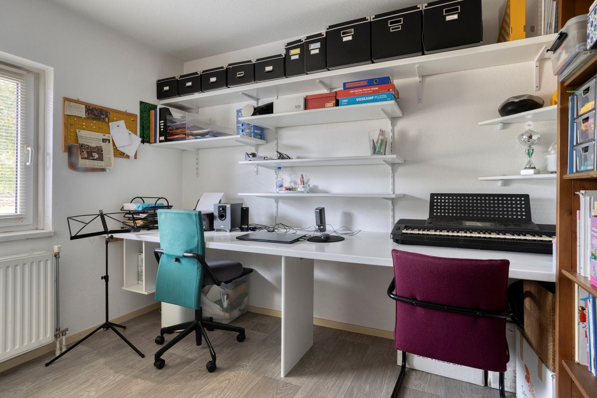 Entree; voorzien van de meterkast, het toilet en de mooie houten trap naar de eerste verdieping. Vanuit de entree is er ook toegang tot een praktisch kantoor, ideaal voor thuiswerken of studie. De eetkamer/woonkamer is het hart van het huis en is gesitueerd aan de voorzijde van de woning. Aansluitend ligt de moderne keuken met diverse Siemens inbouwapparaten, waaronder een inductiekookplaat met afzuiger, een koelkast, een vaatwasser en een combi oven/magnetron.