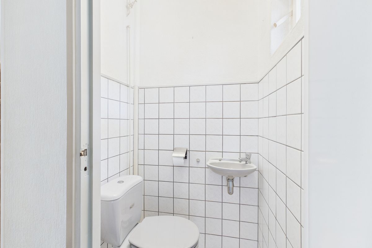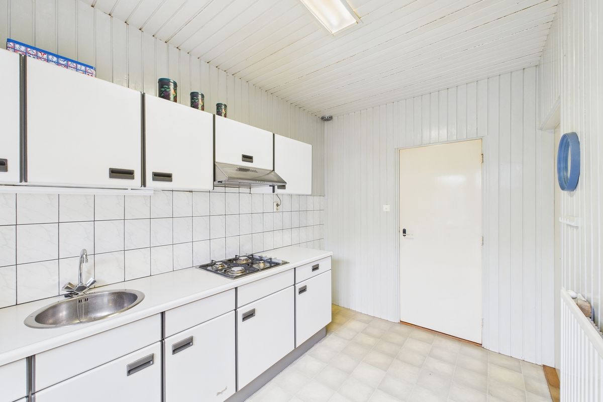 Via de entree met trapopgang, trapkast en toiletruimte kom je in de lichte woonkamer met laminaatvloer. Aansluitend bevindt zich de keuken, deze is uitgerust met een eenvoudig keukenblok met gaskookplaat en afzuigkap. Vanuit de keuken is er direct toegang tot de tuin.