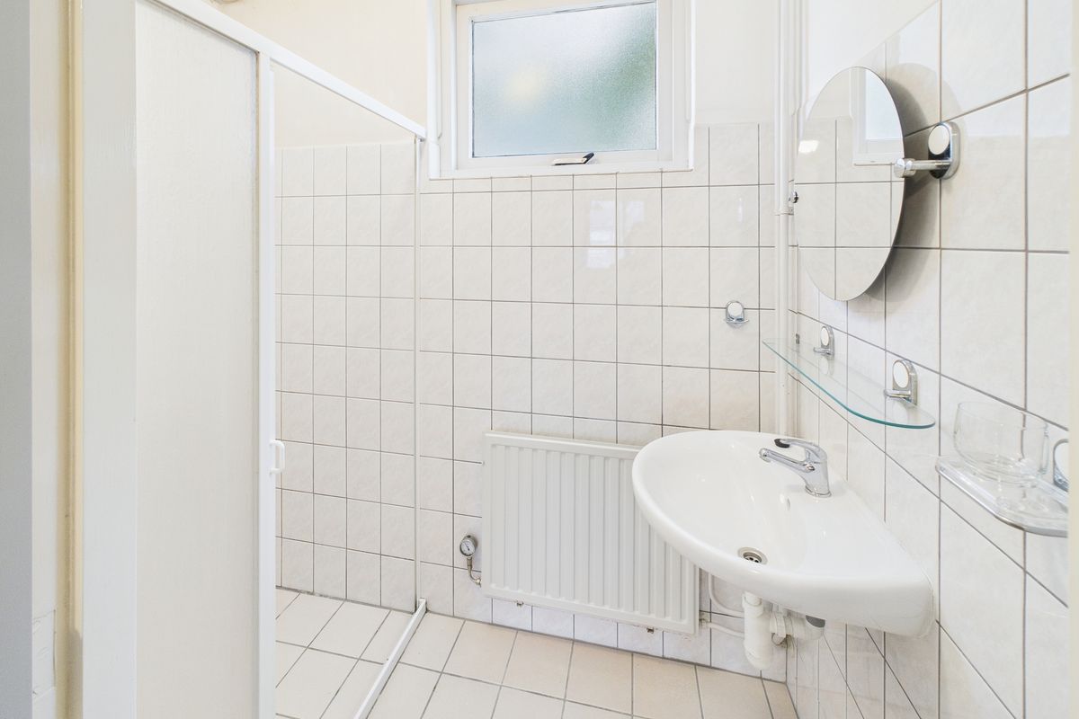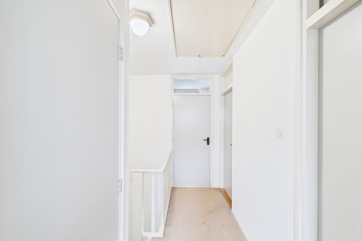 Op de eerste verdieping zijn de badkamer, kastruimte en drie slaapkamers aanwezig. De middelste slaapkamer beschikt over een wastafel. Volledig betegelde badkamer met douche en wastafel.