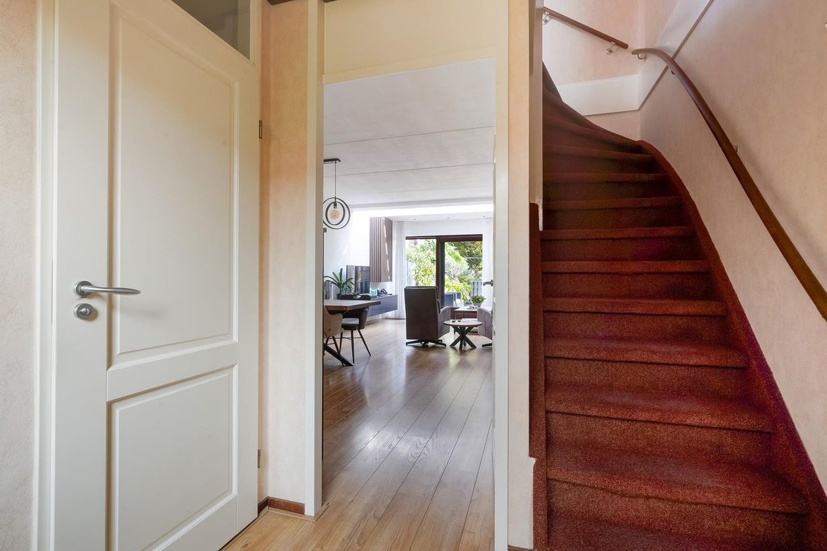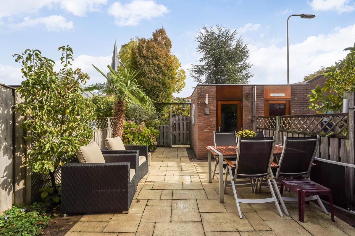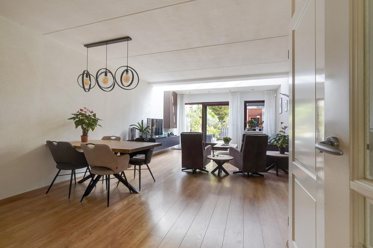 De lichte woonkamer is aan de achterzijde uitgebouwd en voorzien van een prachtige lichtstraat, waardoor er veel natuurlijk licht binnenvalt. De glazen schuifpui geeft toegang tot de fraai aangelegde achtertuin met stenen berging en achterom.