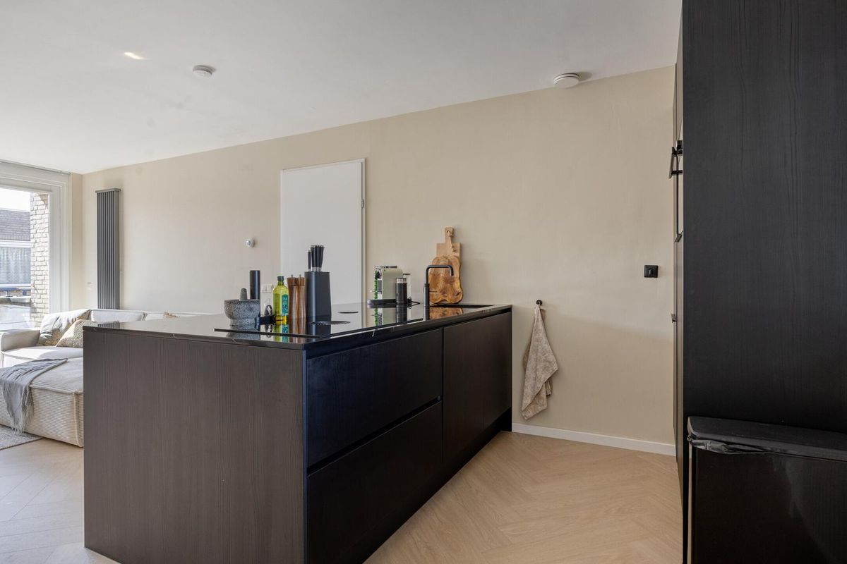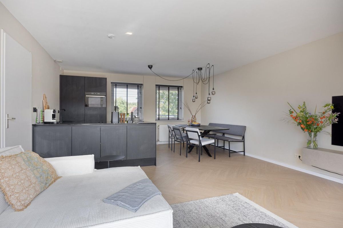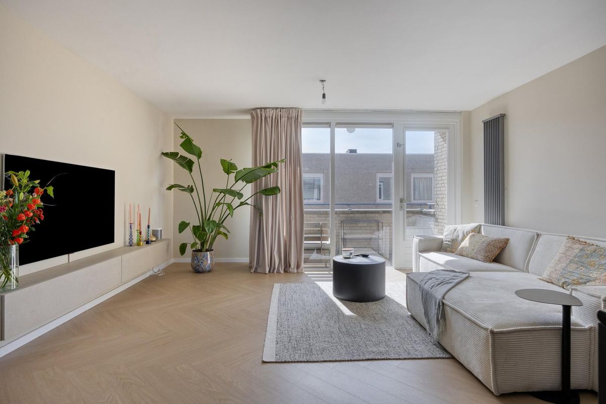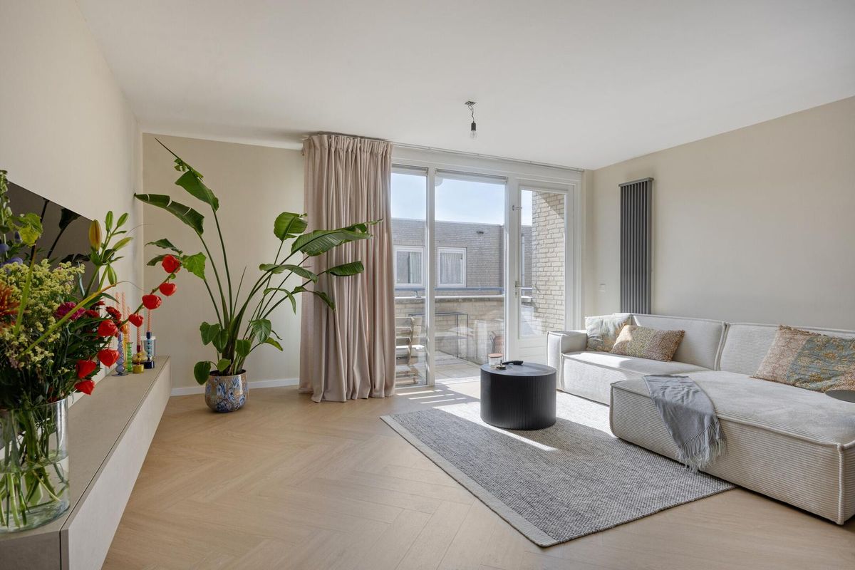 De royale woonkamer met open keuken is een heerlijke lichte ruimte dankzij de grote raampartijen en de loopdeur naar het balkon. De woonkamer is strak afgewerkt met een moderne visgraat vloer (2024) en lichte wanden, waardoor je direct een warme en uitnodigende sfeer ervaart.