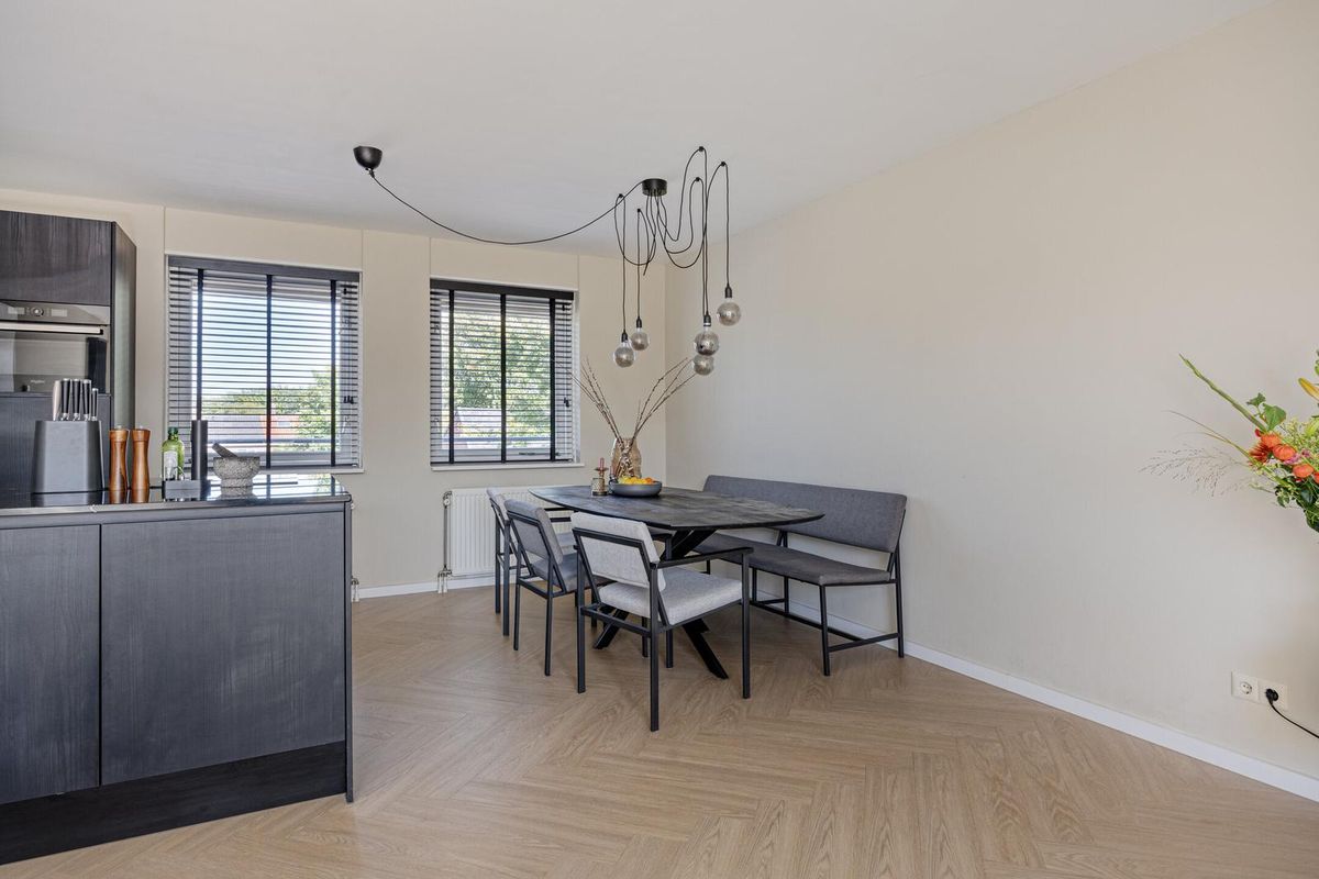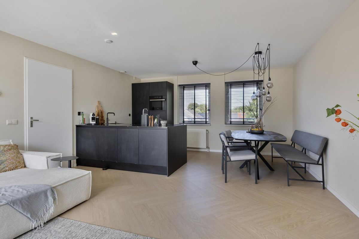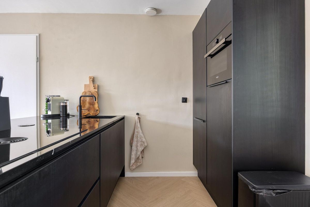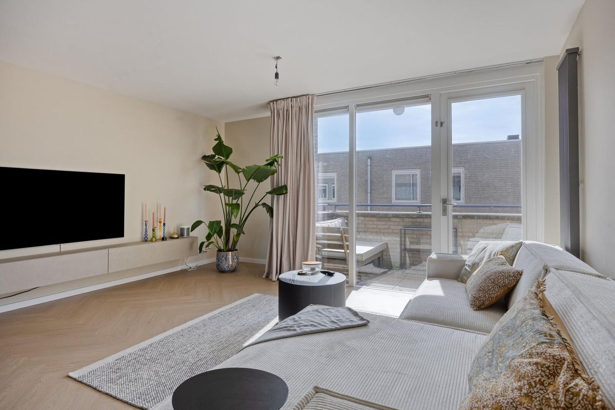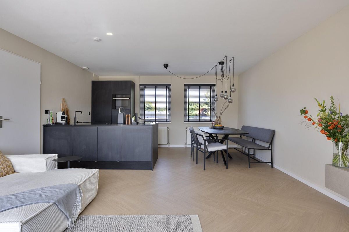De royale woonkamer met open keuken is een heerlijke lichte ruimte dankzij de grote raampartijen en de loopdeur naar het balkon. De woonkamer is strak afgewerkt met een moderne visgraat vloer (2024) en lichte wanden, waardoor je direct een warme en uitnodigende sfeer ervaart.