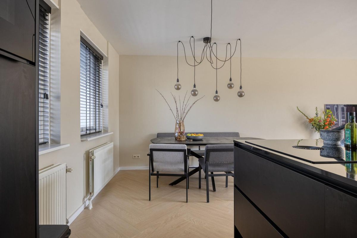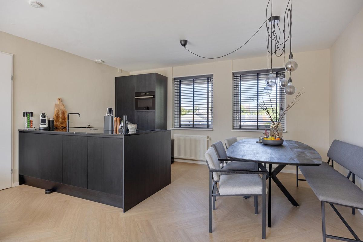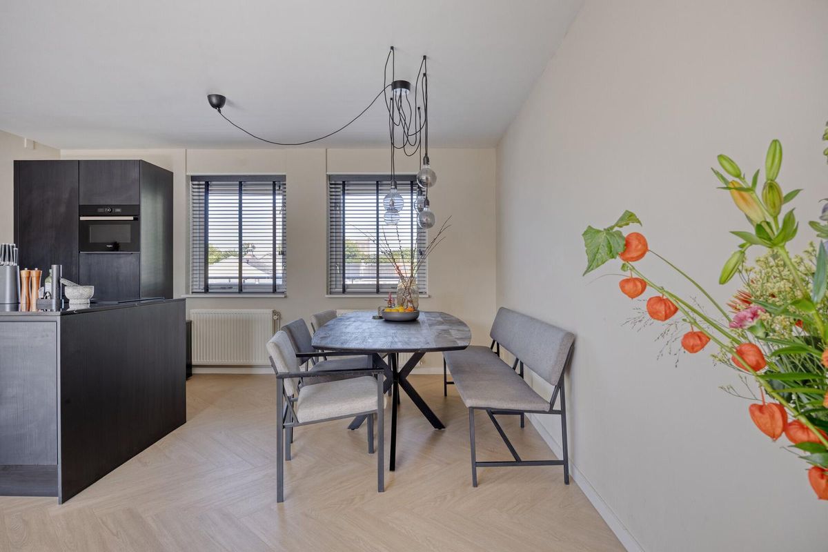 De moderne keuken is uitgevoerd in een stijlvolle donkere kleurstelling en voorzien van de nodige inbouwapparatuur, waaronder een kookplaat met afzuiging, oven, koelkast, vaatwasser en een spoelbak. De eethoek biedt plek voor een grote tafel waar je gezellig kunt dineren met familie of vrienden.