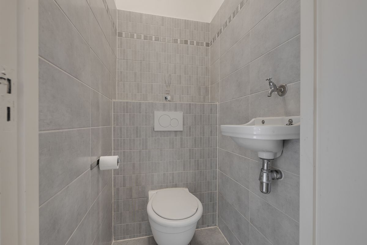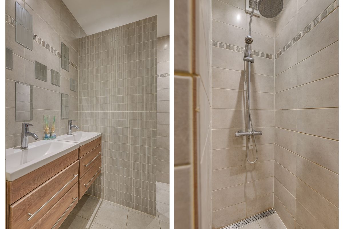 De badkamer is eigentijds met een ruime inloopdouche, dubbele wastafel en neutrale tegelafwerking. Het toilet is separaat.