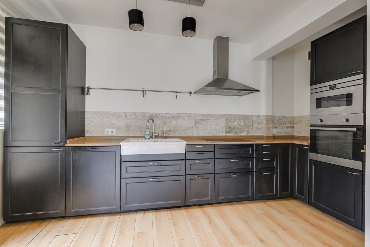 De open keuken is modern uitgevoerd, voorzien van een inductiekookplaat, afzuigkap, oven, magnetron en vaatwasser. De zwarte fronten en houten werkbladen geven de ruimte karakter.