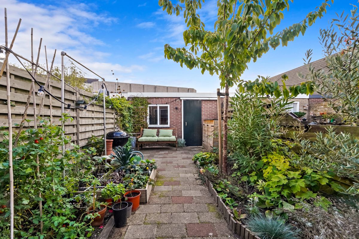 De achtertuin van ca. 32 m² is afgeschermd middels een houten erfafscheiding en verder voorzien van terras, groenborders, een authentieke waterpomp,