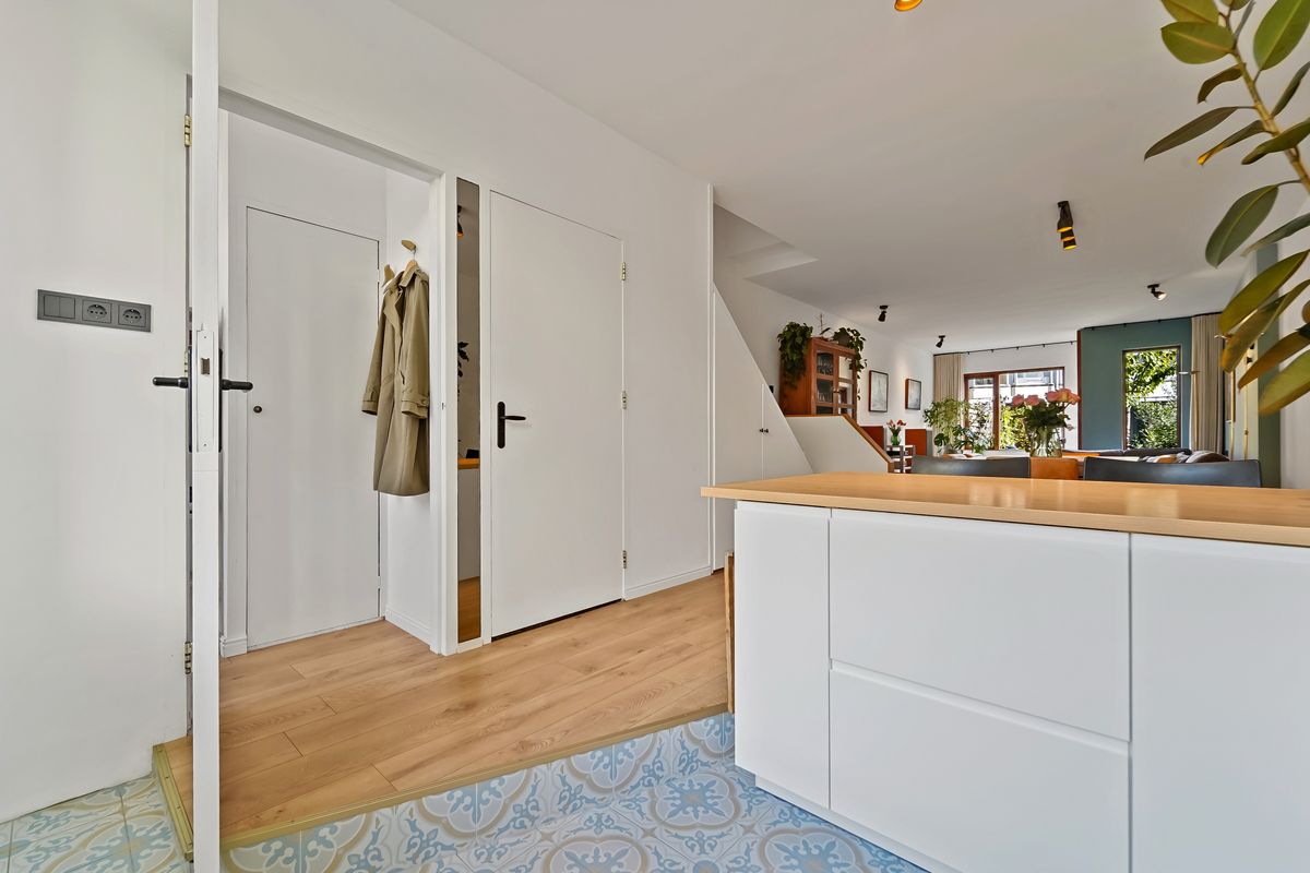 Toegang tot de open keuken, toilet en woonkamer met deur naar de achtertuin.