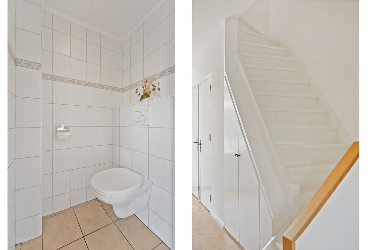 • Trapkast met wasmachine-aansluiting en bergruimte.