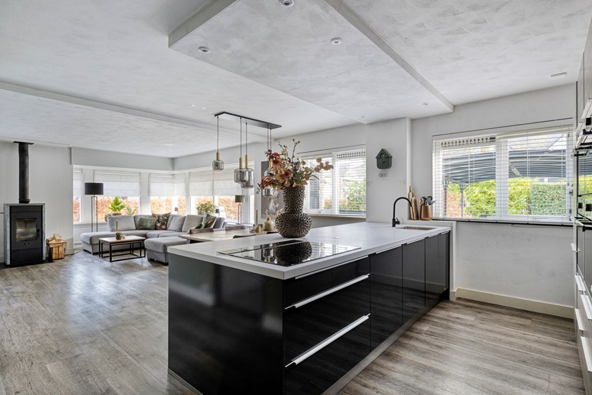 Aan de achterzijde van de woning treft u de open leefkeuken, die modern is afgewerkt en volledig instapklaar is. Het langwerpige kookeiland vormt het hart van de ruimte en nodigt uit tot samen koken en tafelen. Langs de wand vindt u een strakke kastenopstelling met hoogwaardige ovencombinatie en koelkast. Het kookeiland beschikt over een inductiekookplaat met geïntegreerde afzuiging, vaatwasmachine en een spoelbak. De keuken biedt daarnaast meer dan voldoende opbergruimte in de lades en kastjes en sluit naadloos aan op de rest van de leefruimte.