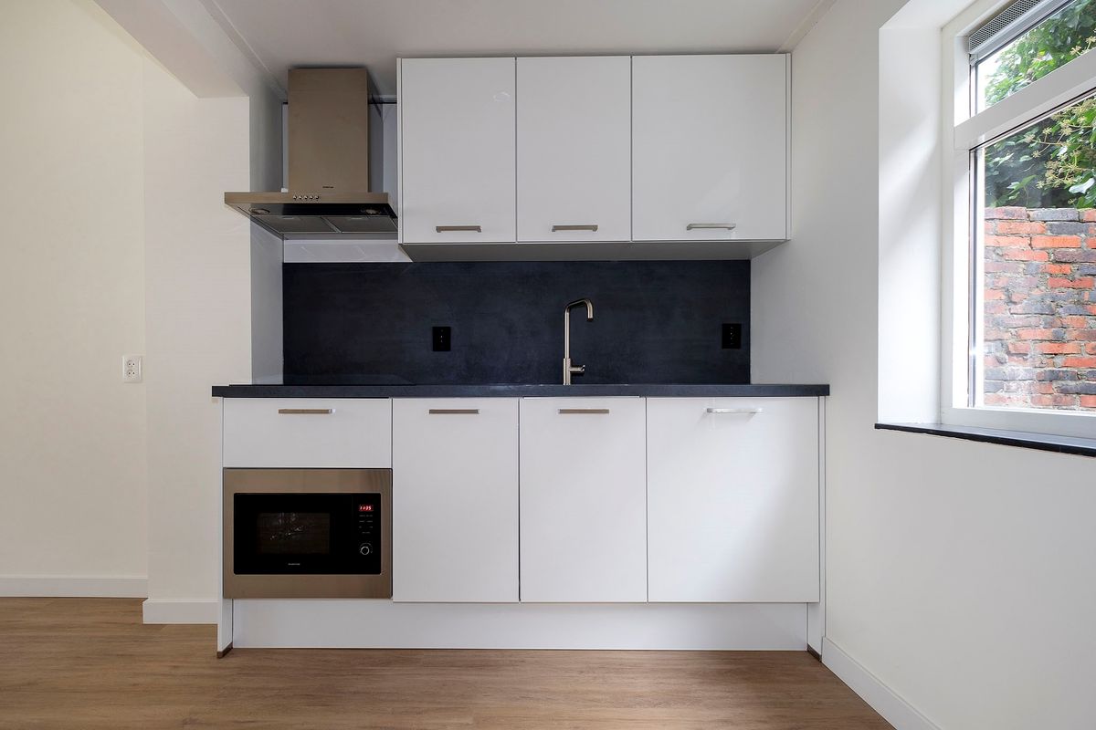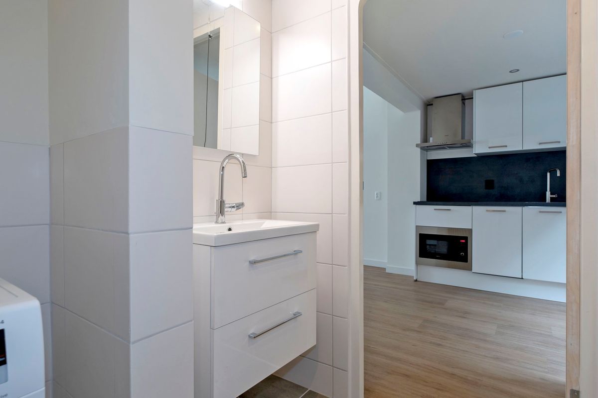 Via de gezamenlijke entree toegang via de trapopgang naar de woon/slaapkamer met open keuken, badkamer voorzien van inloopdouche, wc en wastafelmeubel en balkon (zuidoost).