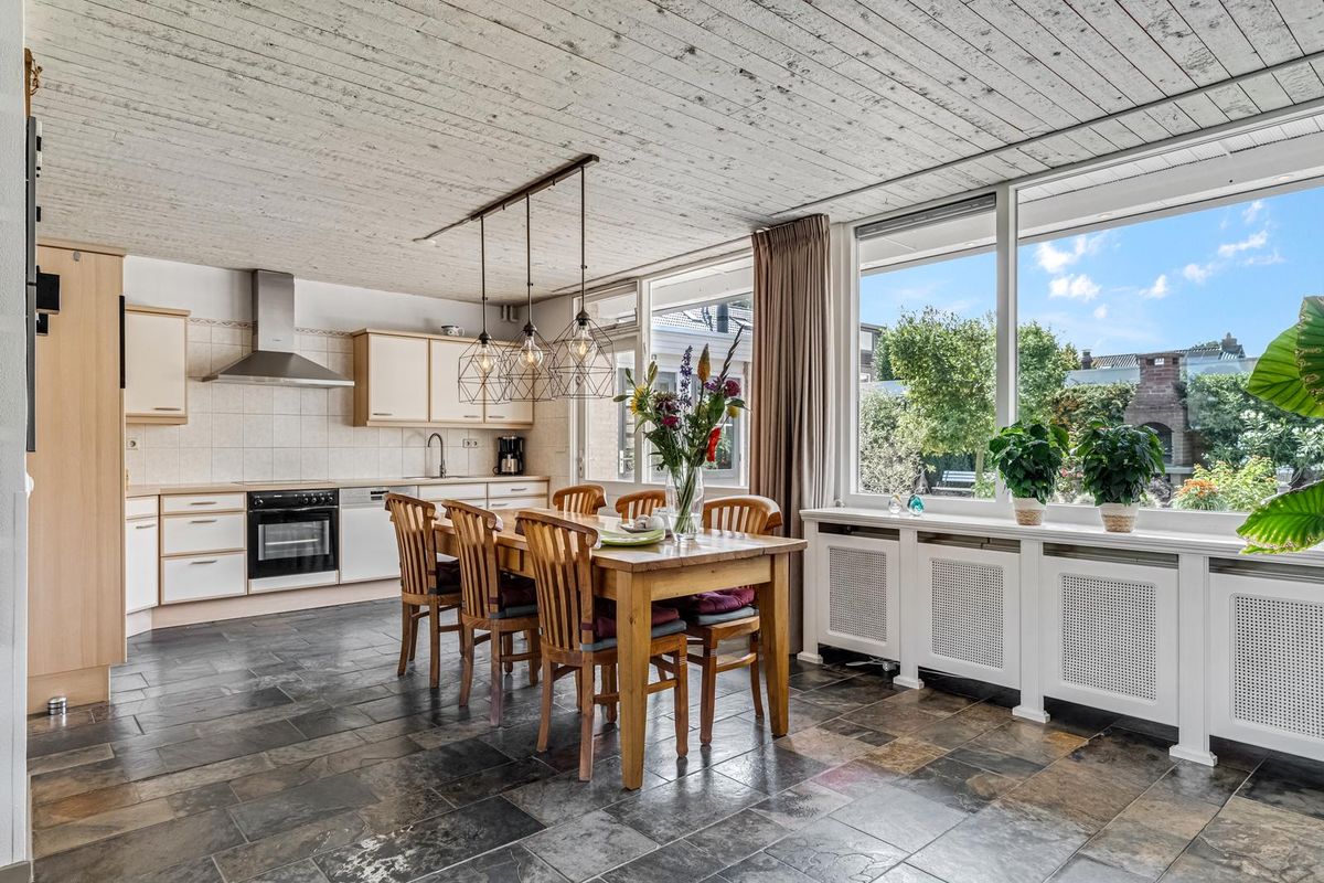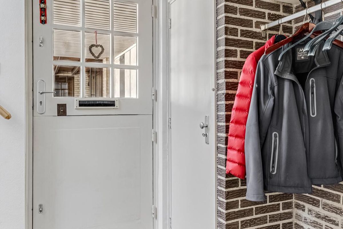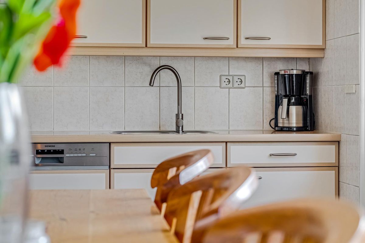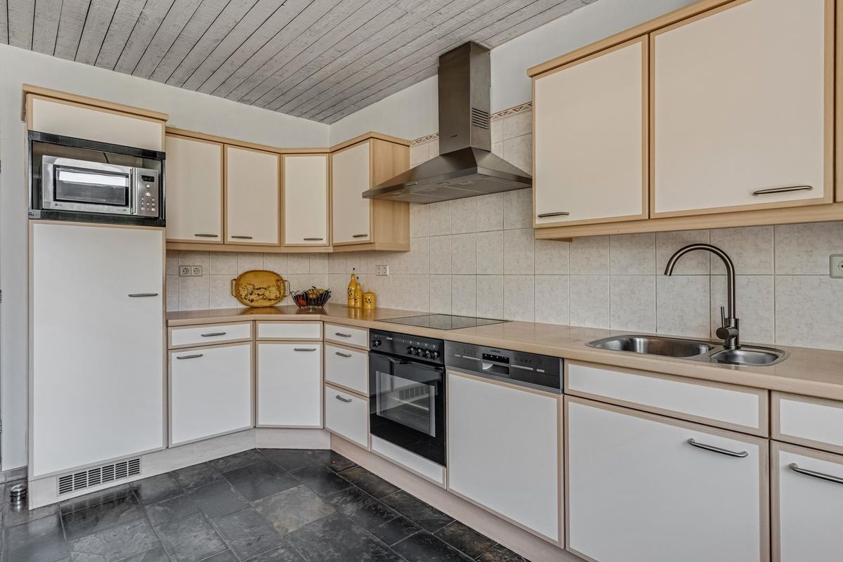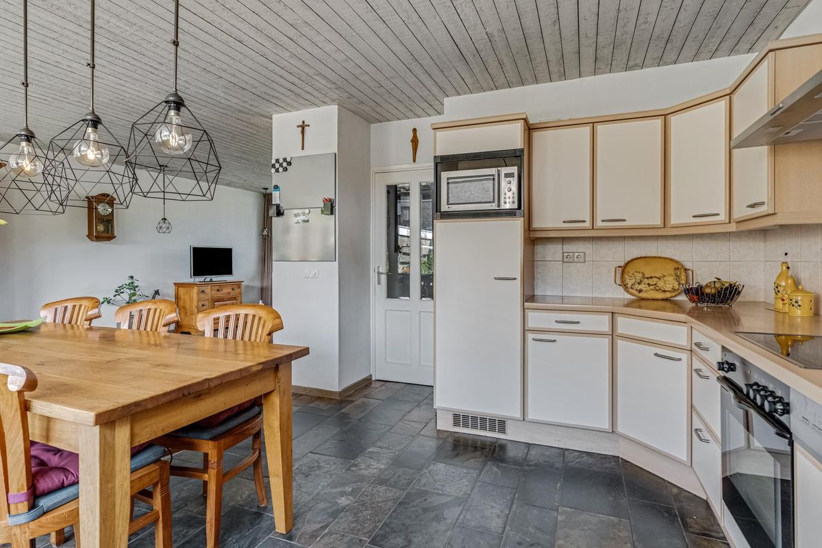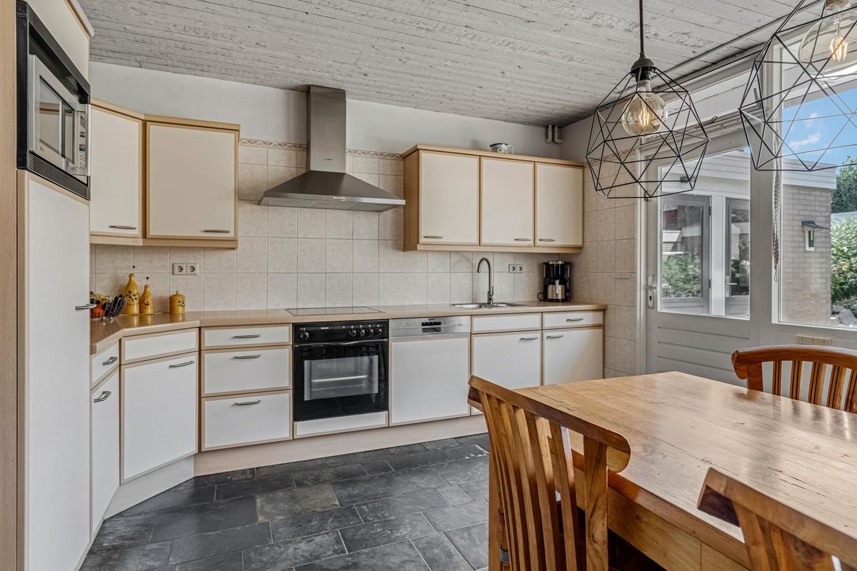 De open keuken is netjes en compleet, met een hoekopstelling en volop kastruimte. Via de achterdeur loop je zo de tuin in, wat handig is als je buiten wilt eten of gewoon even wilt genieten van het weer.