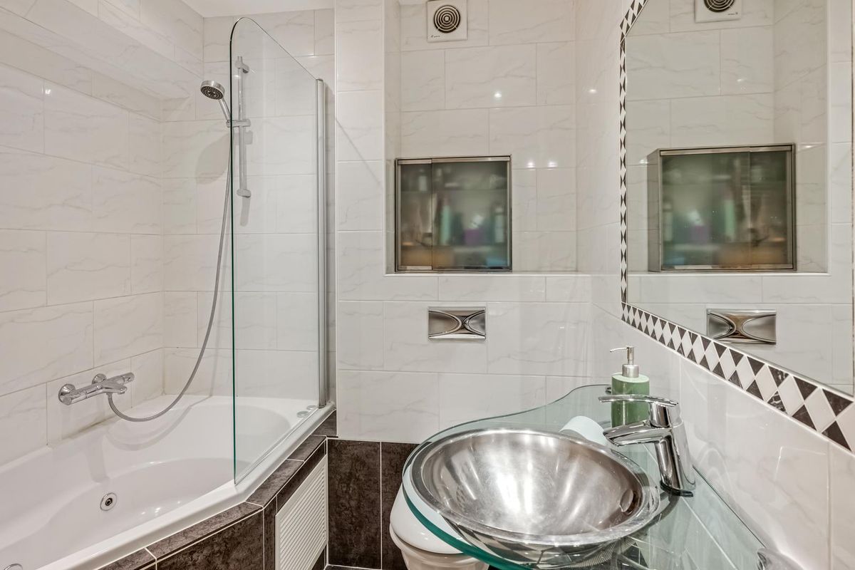 De badkamer is slim ingericht en voelt ruimtelijk aan. Licht betegeld, met een glazen wastafel, ligbad met douche en een glazen scherm. De grote spiegel maakt het plaatje compleet.