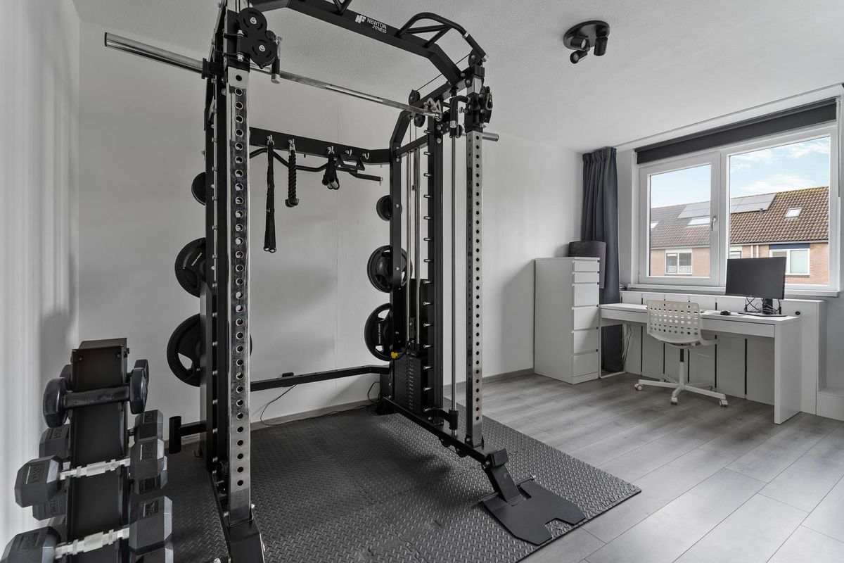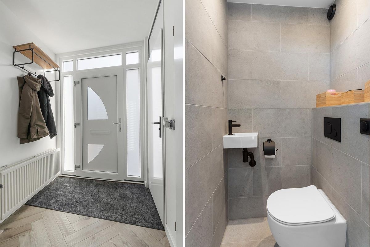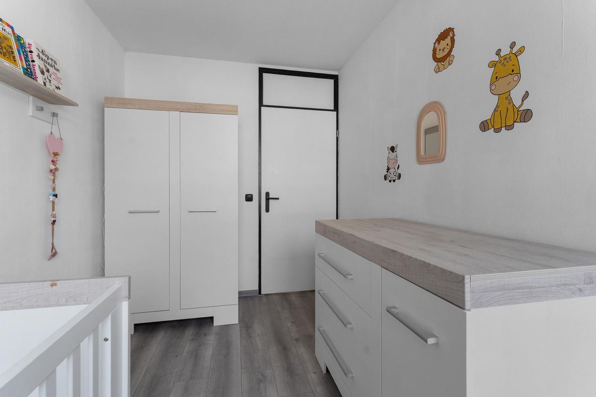 Eerste verdieping: Overloop met bergkast en toegang tot drie in grote variërende slaapkamers en de in 2023 vernieuwde badkamer. De badkamer is voorzien van lichte betegeling tot aan het plafond, inloopdouche, toilet, dubbele wastafel met meubel en een raam voor extra ventilatie. De gehele verdieping is voorzien een nette laminaatvloer.