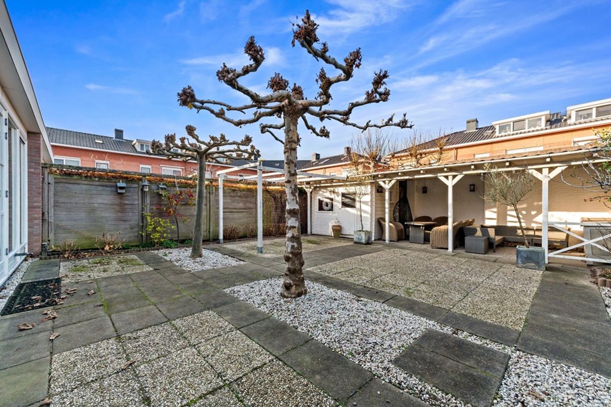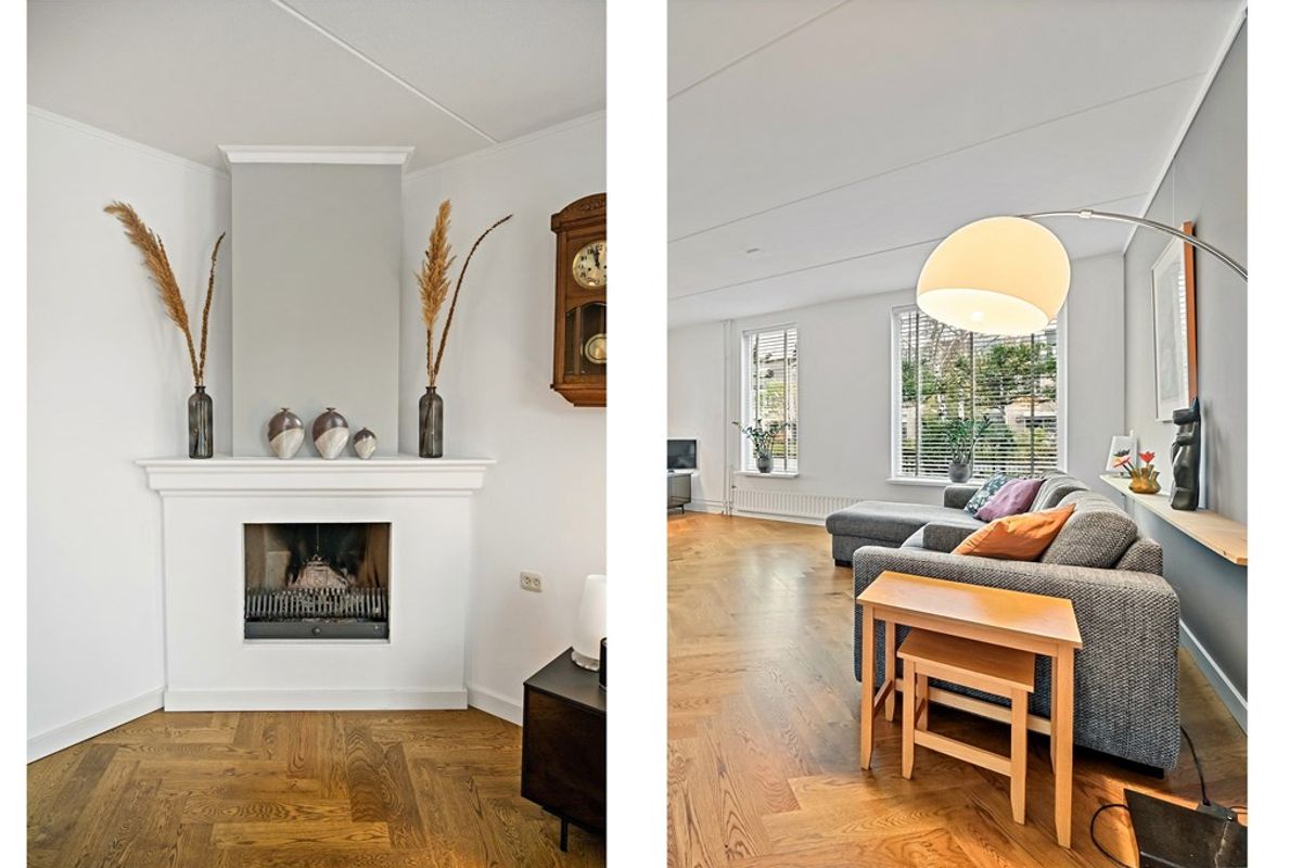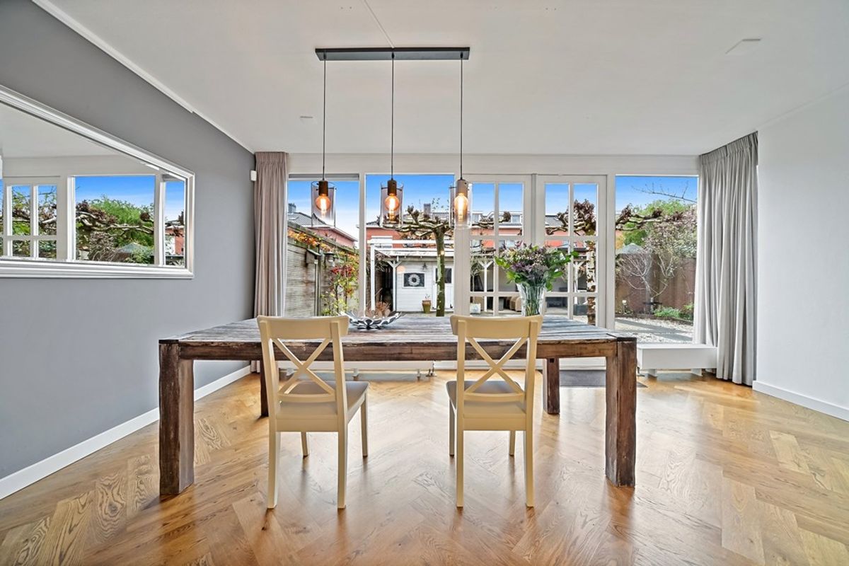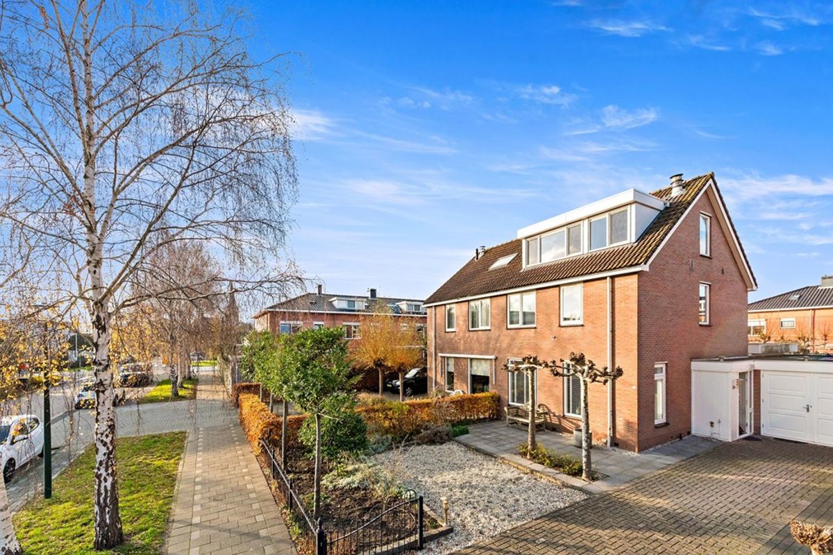 De woning valt direct op door de diepe voortuin en ruime oprit waar met gemak meerdere auto’s kunnen worden geparkeerd. Via de zij-entree komt u in de hal met trapkast, meterkast, trapopgang naar de verdieping en moderne toiletruimte. Het toilet is volledig betegeld en voorzien van wandcloset en fonteintje. Vanuit de hal bereikt u de royale woonkamer met visgraat parket en aan de voorzijde een sfeervolle zithoek met open haard. Dankzij de raampartijen aan de voor- en zijkant, is deze ruimte aangenaam licht. Aan de achterzijde bevindt zich de uitgebouwde woonkeuken; dé centrale plek in dit huis voor gezellige gesprekken of een heerlijk diner. De grote uitbouw aan de achterzijde is geplaatst in 2008 en biedt volop ruimte voor een extra grote eettafel. De open, moderne keuken met eiland bevindt zich in het midden van de woning. De matzwarte keuken met marmerlook composietstenenwerkblad is voorzien van veel bergruimte én diverse Siemens inbouwapparatuur waaronder een inductie kookplaat, afzuigkap, koelkast, vriezer, vaatwasser, oven, magnetron en spoelbak met Quooker. Via de openslaande deuren aan de achterzijde is de zonnige, op het noordwesten gelegen achtertuin te bereiken. In de achtertuin is een berging en overkapping aanwezig. Dankzij de brede opzet van de tuin is hier ruimte voor meerdere terrassen waardoor er altijd wel een plekje in de zon of schaduw te vinden is. De tuin is tevens te bereiken via de naastgelegen poort. De garage grenst direct aan de woning en is voorzien van een dubbele deuren én een inpandige deur naar de woning. Indien gewenst kan een gedeelte van de garage/bijkeuken worden verbouwd tot praktijk-, kantoor-, of hobbyruimte aan huis.