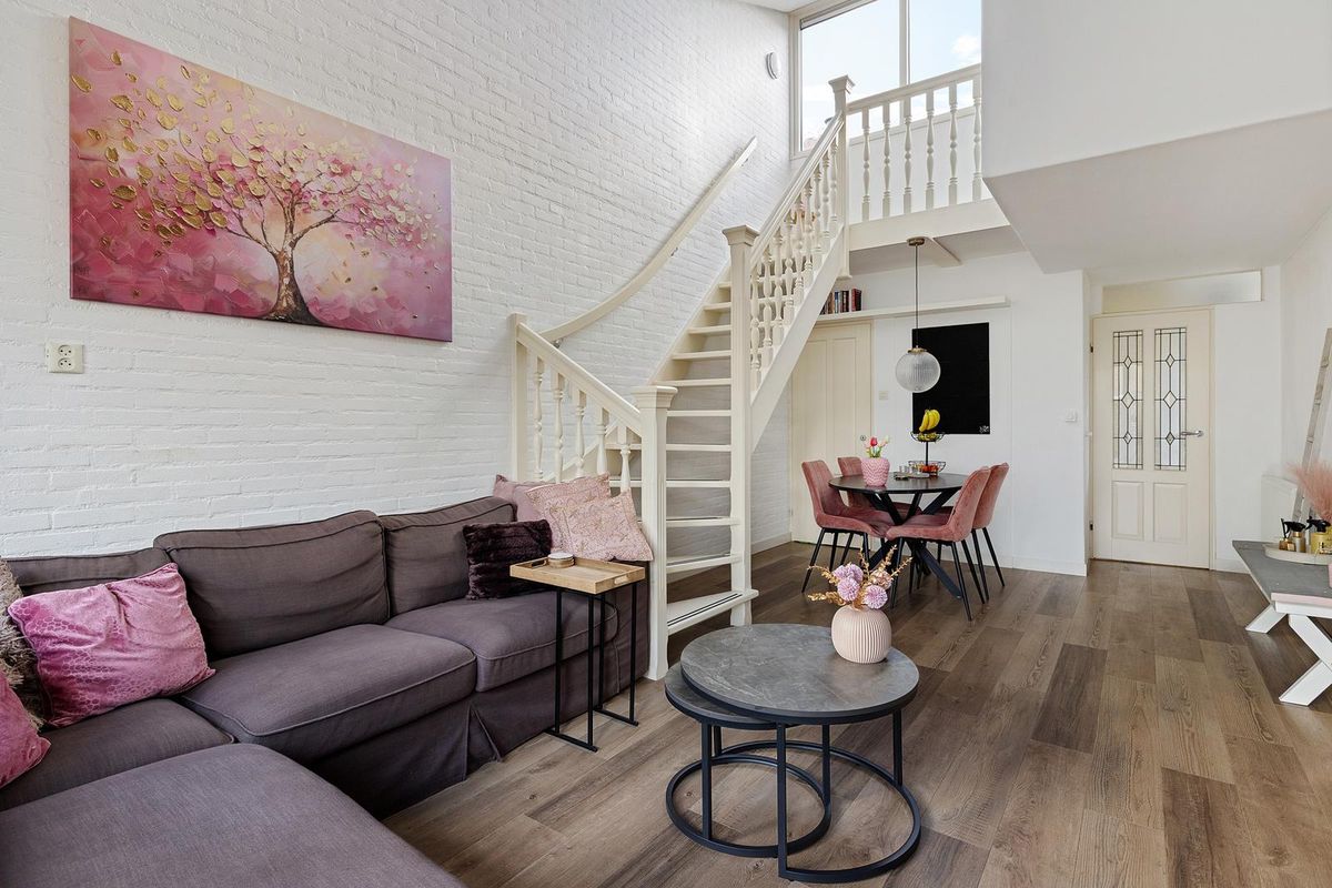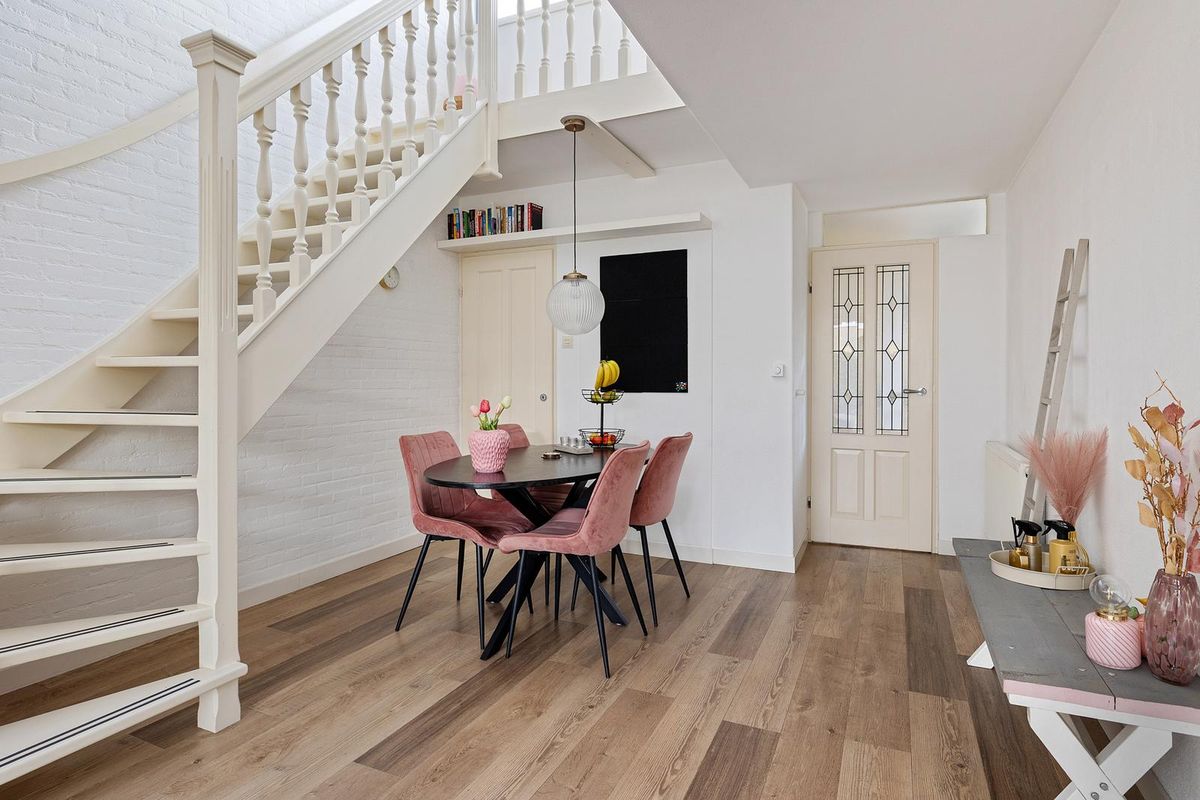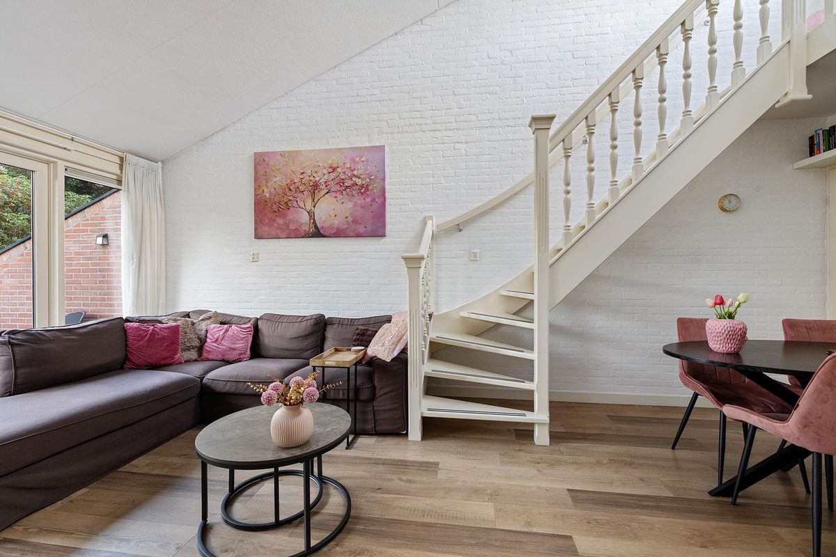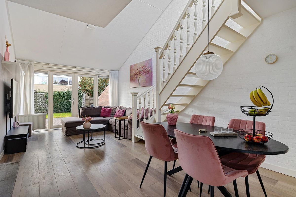 De tuingerichte woonkamer heeft tuindeuren naar de tuin en een open trap naar de verdieping. Door de schuine kap met vide en de raampartij komt er veel lichtinval in de woning. Bij het eetgedeelte is een extra bergkast aanwezig.