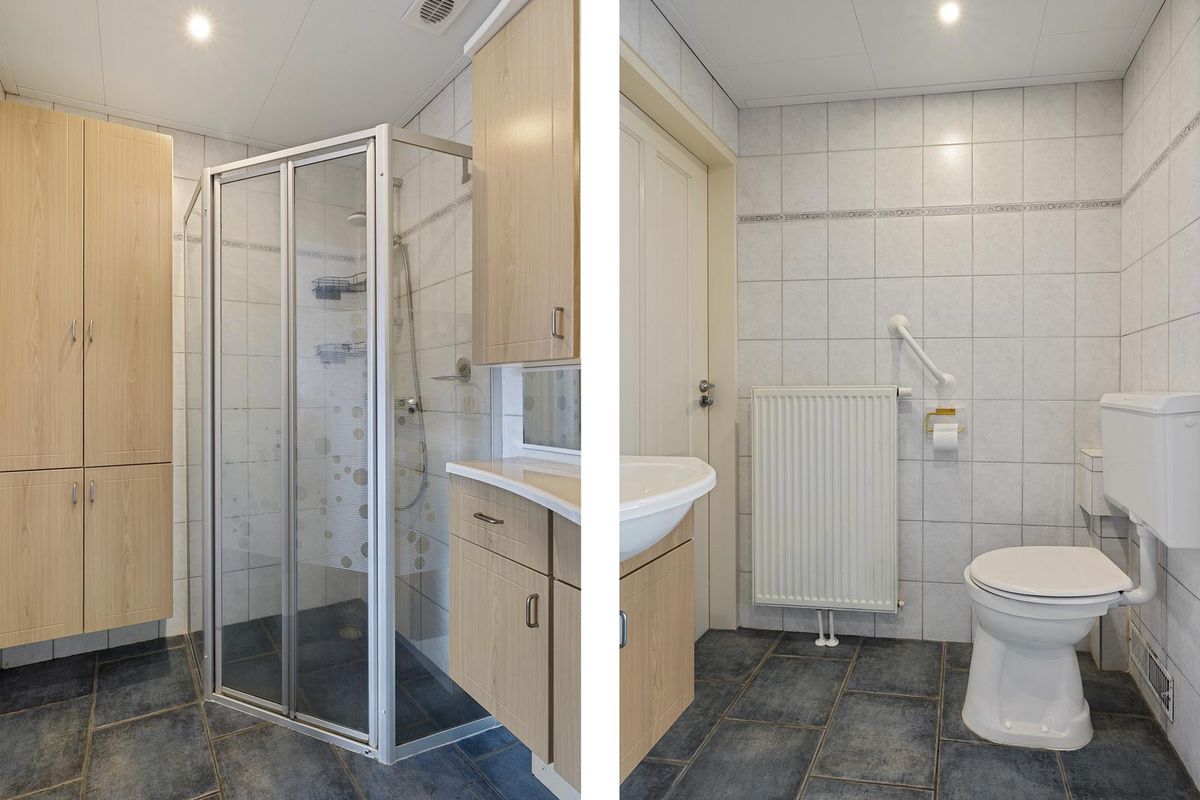 Je stapt vanuit je bed zo onder de douche. De badkamer is netjes, volledig betegeld en voorzien van een douchecabine, een wastafelmeubel, een bergkast en een toilet. Vanuit de hal is de badkamer ook te bereiken.