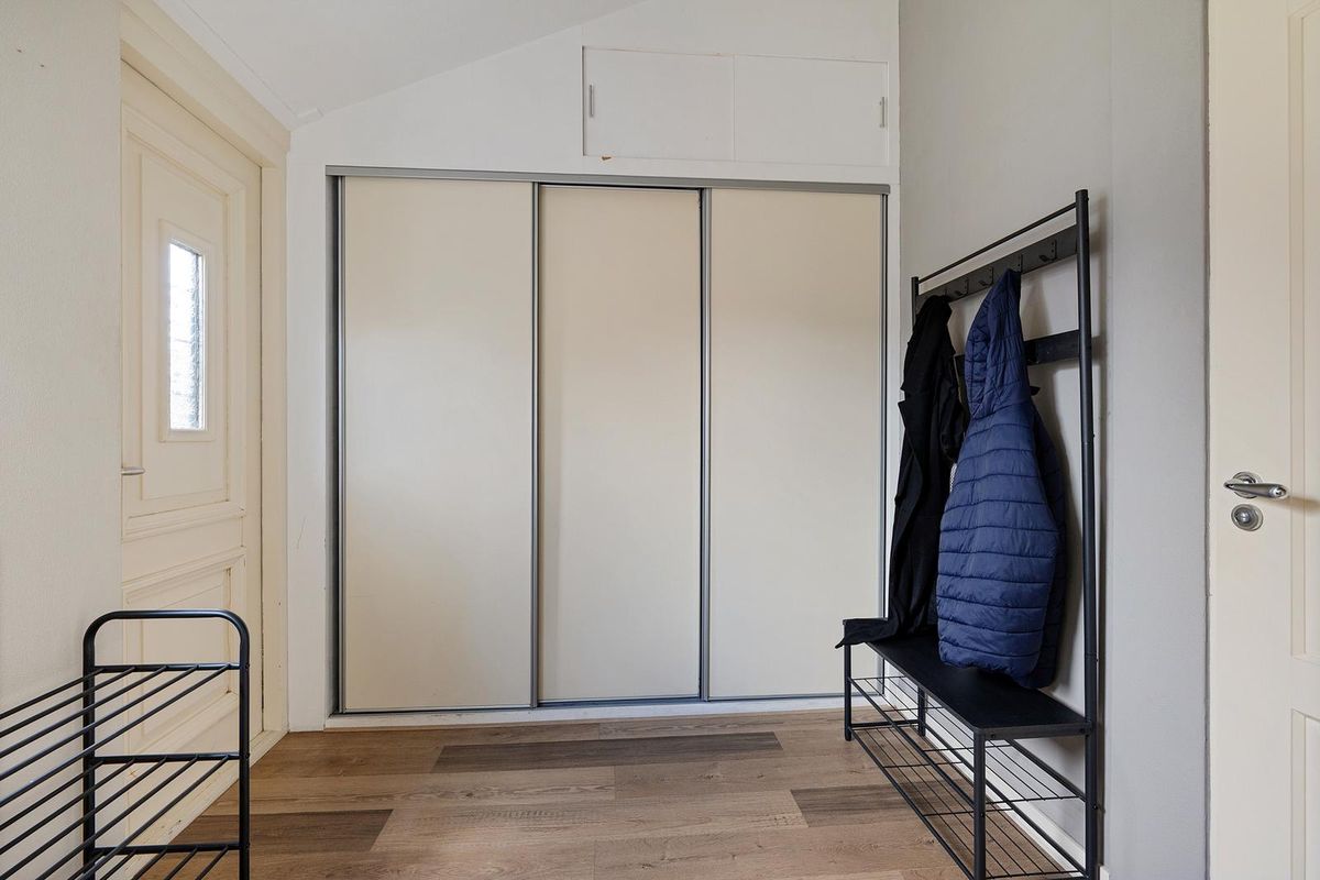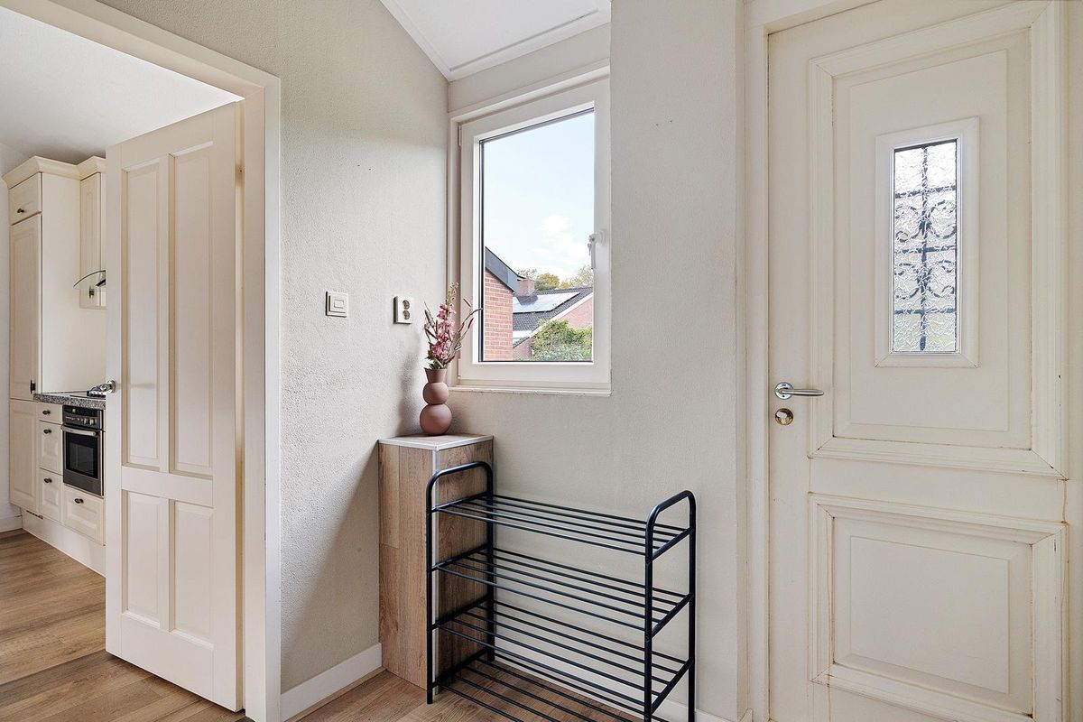 Je stapt de woning nu binnen via de linker deur in de ruime hal met een kastenwand over de breedte. Zo zijn de cv-ketel en de witgoedaansluitingen mooi uit het zicht en is er bergruimte.
