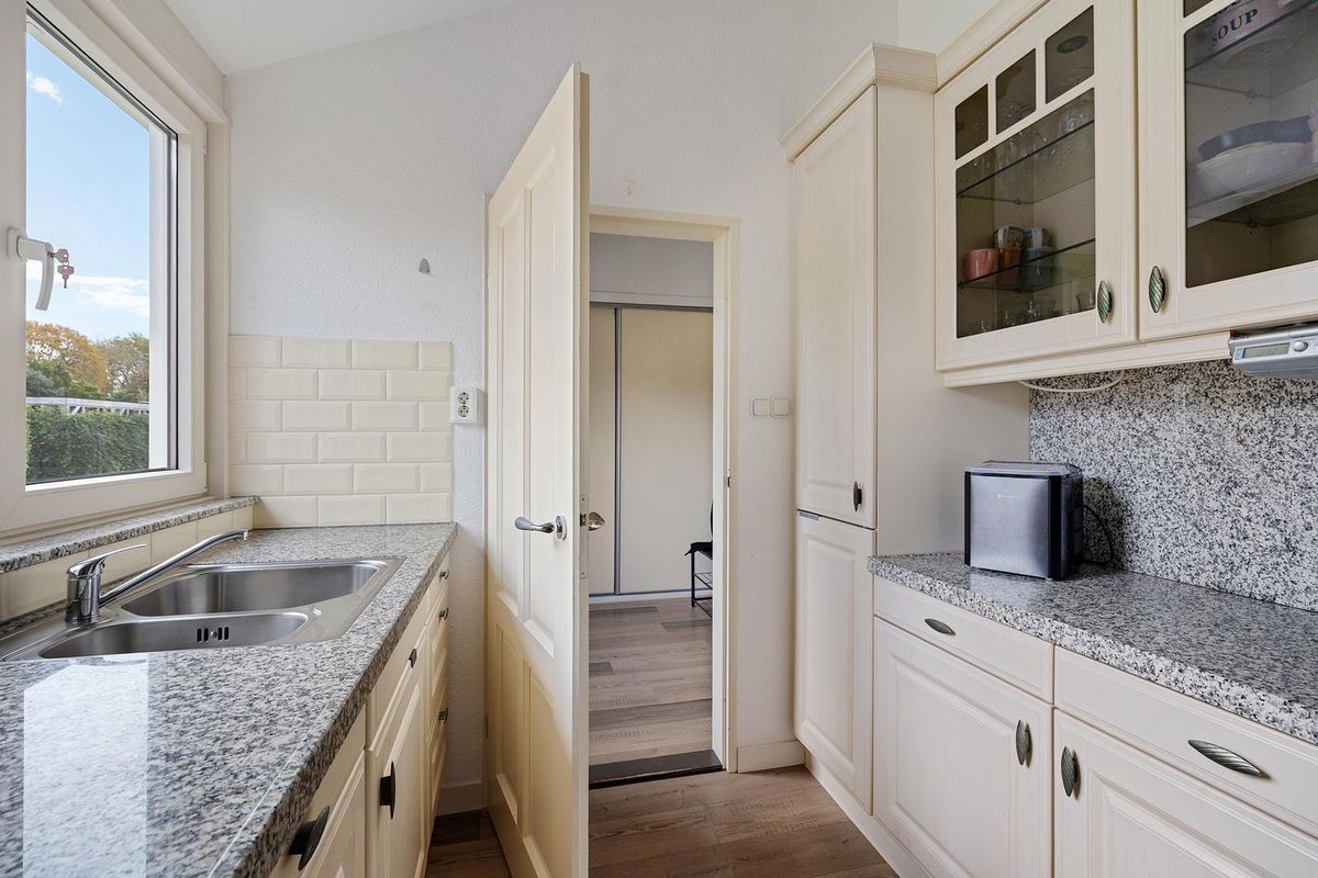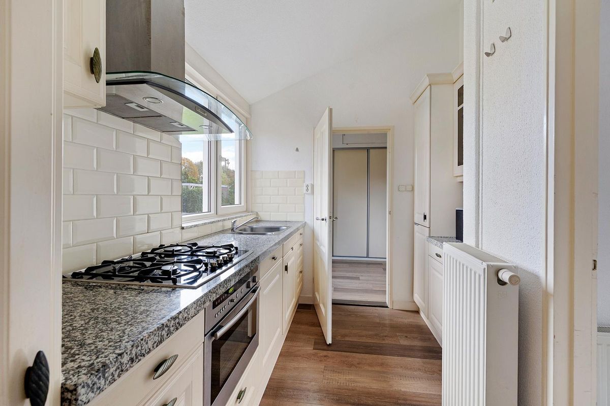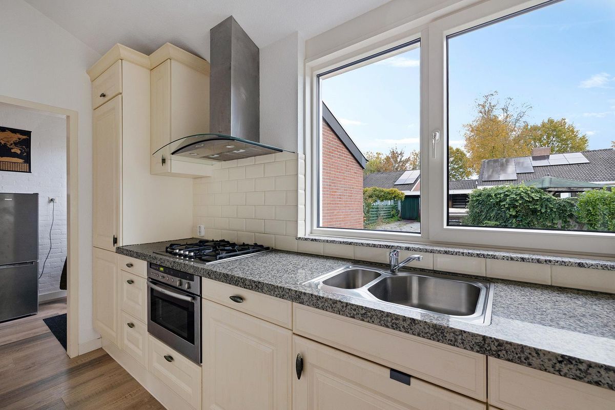 De gesloten en complete inbouwkeuken (2007) aan de straatzijde met raampartij heeft aan twee zijden een natuurstenen werkblad en is uitgevoerd met een inbouw kookplaat en afzuigkap, een oven, een koelkast en een vaatwasser.