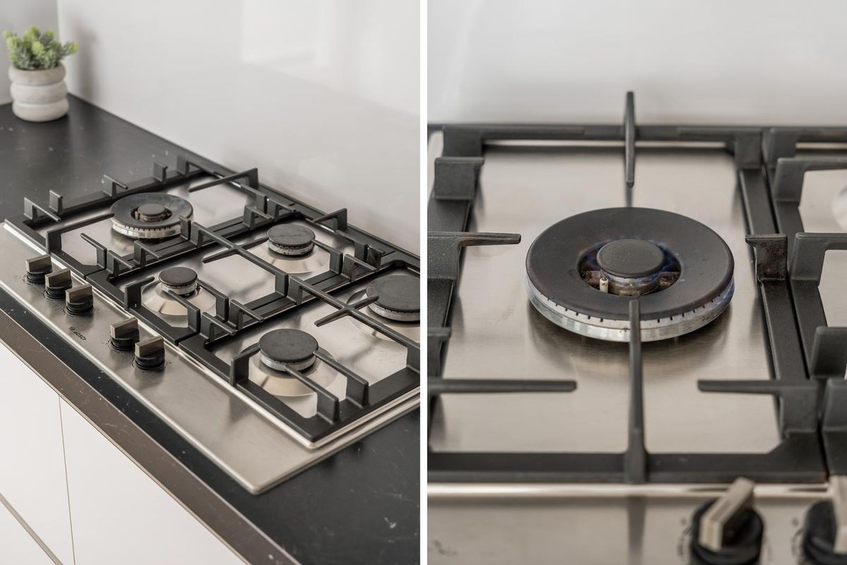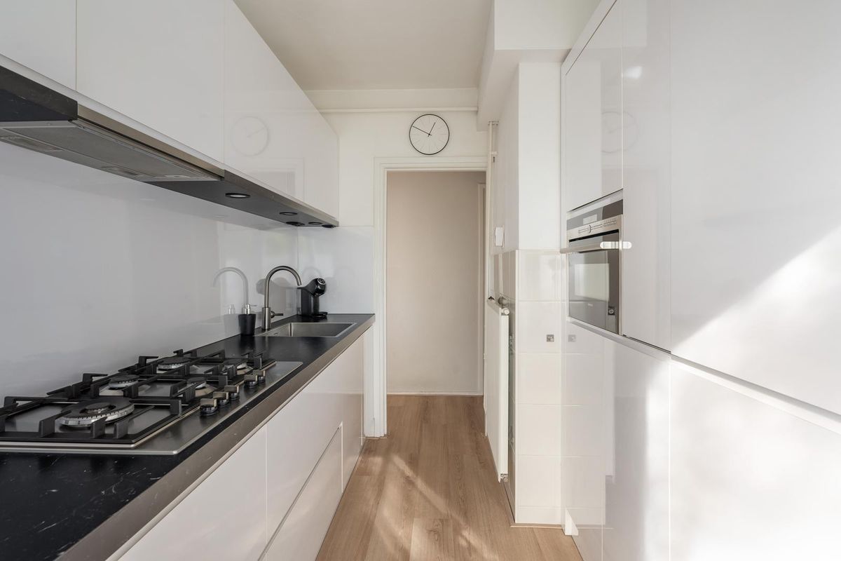 De keuken is opgesteld in een parallelle uitvoering en heeft hoogglans witte fronten en een stijlvol kunststof werkblad. De luxe uitstraling wordt versterkt door de aanwezige “Siemens” inbouwapparatuur, waaronder een vijf-pits gasfornuis met afzuigkap, een koelkast, vriezer, combimagnetron en vaatwasser. Ook vanuit de keuken geven openslaande deuren toegang tot het balkon.