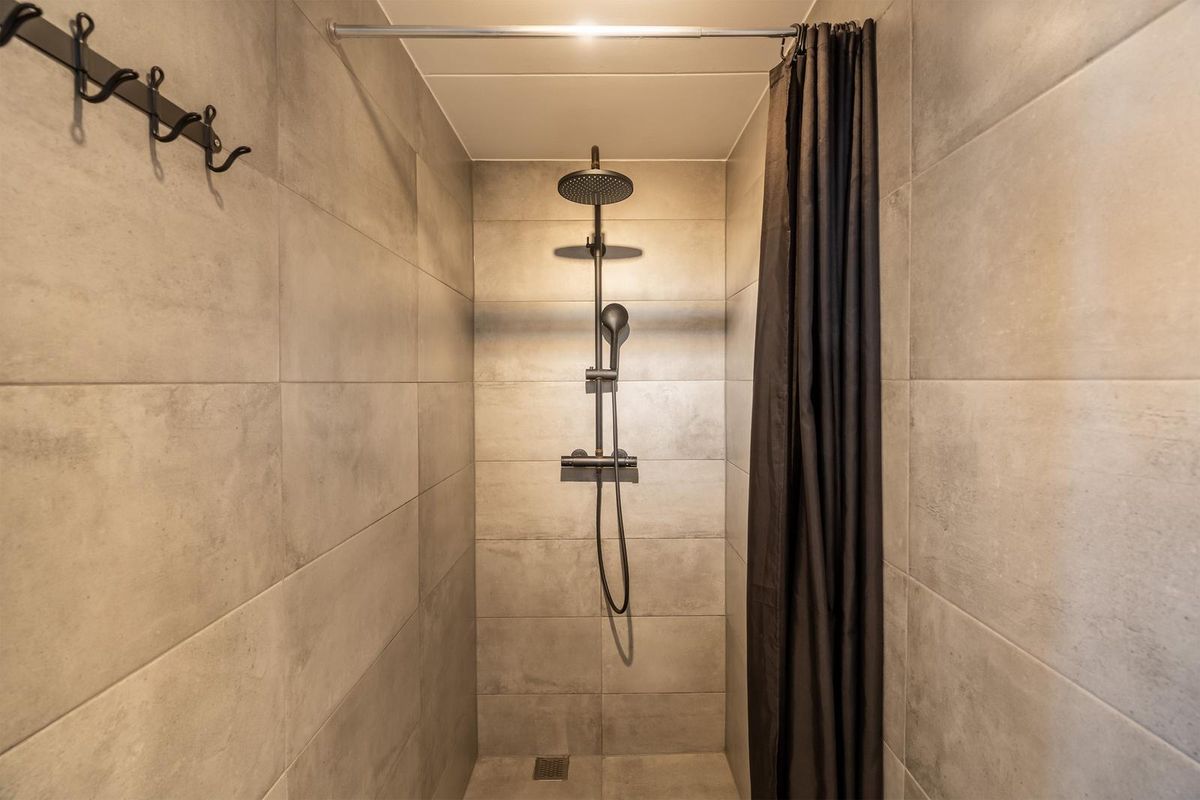 Aansluitend vind je de badkamer (toegang vanuit de keuken), die keurig is afgewerkt met moderne tegels in een mooie grijstint, een inloopdouche en een wastafelmeubel.
