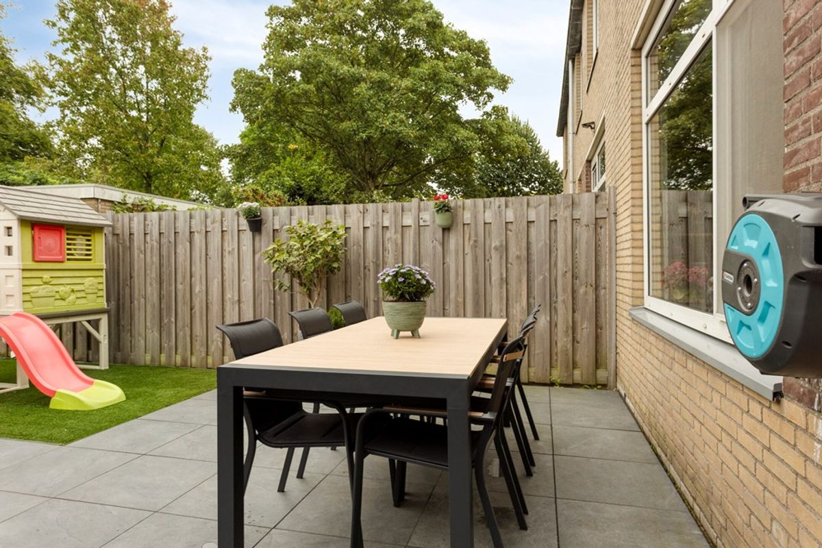 De achtertuin ligt op het noorden, maar biedt dankzij de diepte de hele dag zon. Achterin vind je een praktische berging en een achterom.