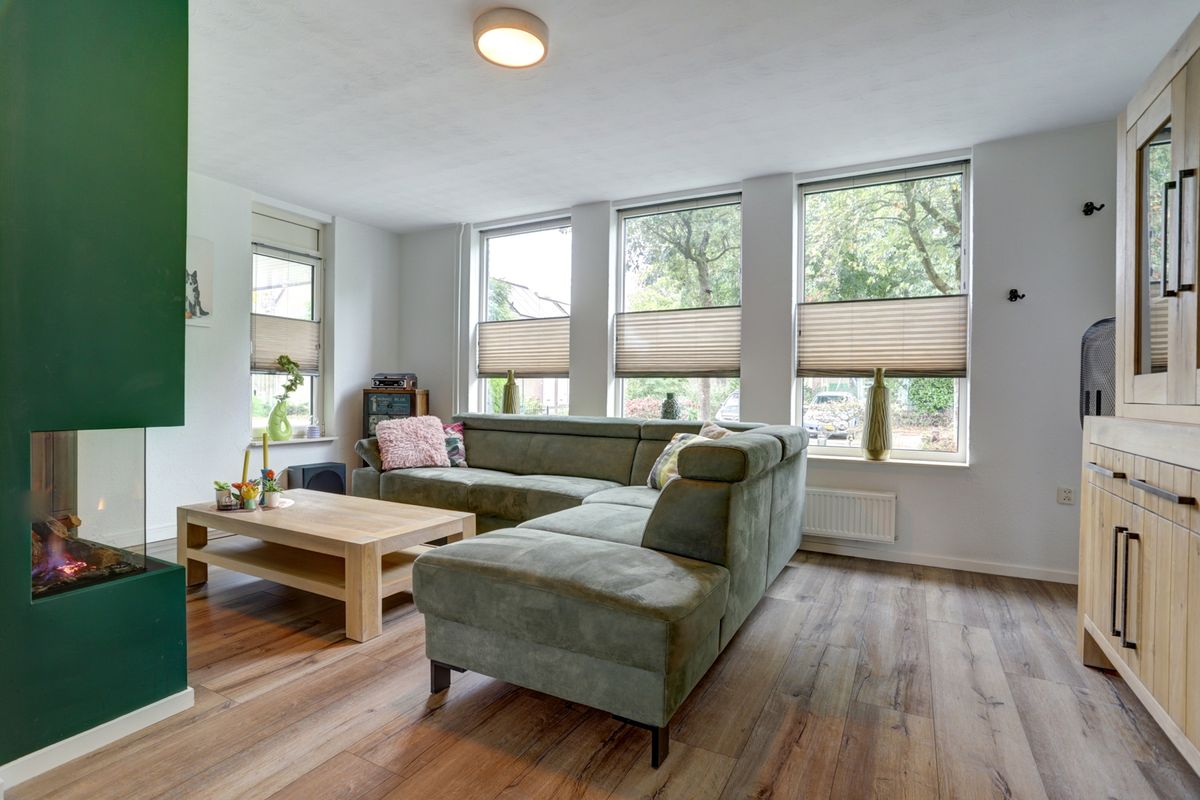 De woonkamer is een heerlijke lichte ruimte met grote raampartijen aan de voorzijde, waar het daglicht rijkelijk naar binnen stroomt. Aan deze kant is de zithoek gesitueerd, dé plek waar je na een lange dag helemaal tot rust komt.